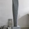 I regularly make sculpturesinspired on a small movement, rotation or bend (see also my sculptures "Fier" and "Whispering"). While working, such a sculpture remains formless for quite a long time. It only comes to life when there is good tension on the surfaces. Nice to work towards that. And although this sculpture is quite large, everything is carved by hand. It is made from Celtic brown, a brown-gray Irish bluestone. Suitable for outdoor use.