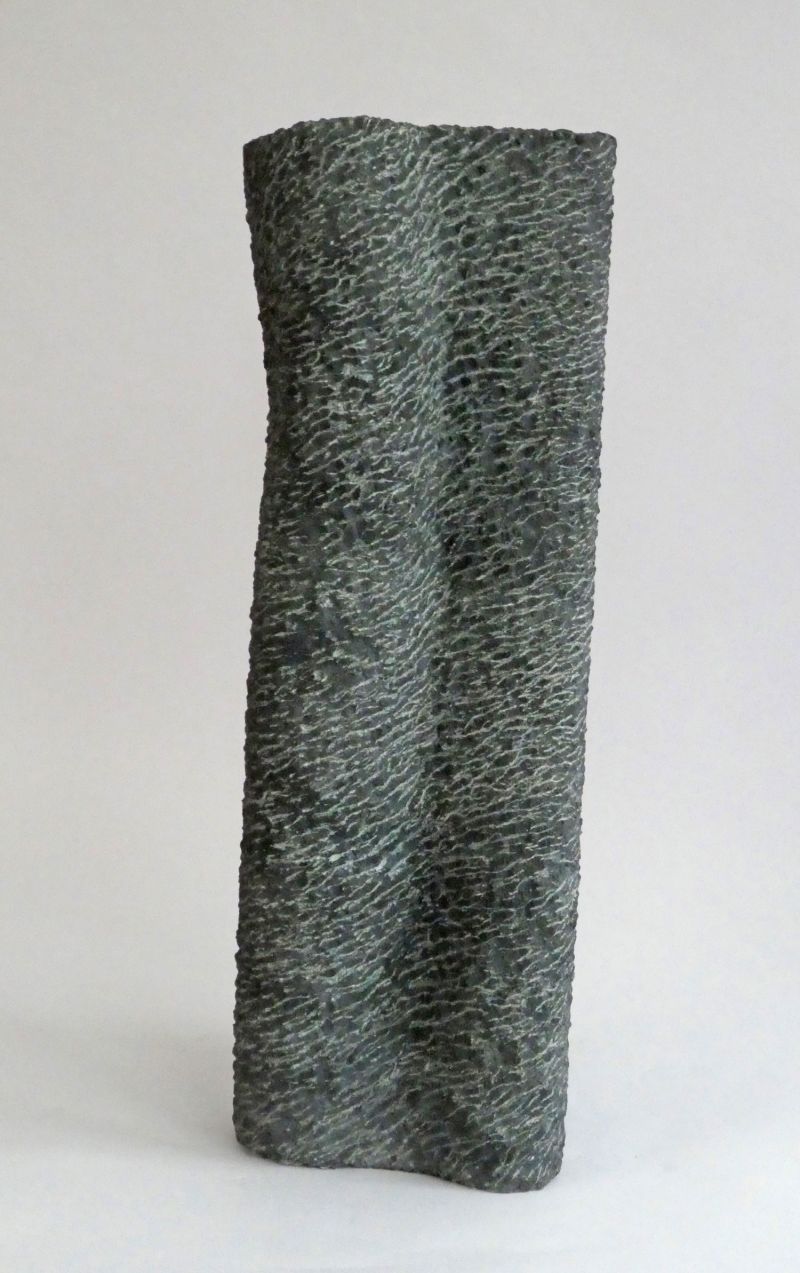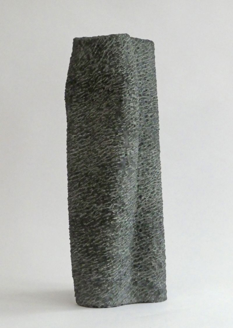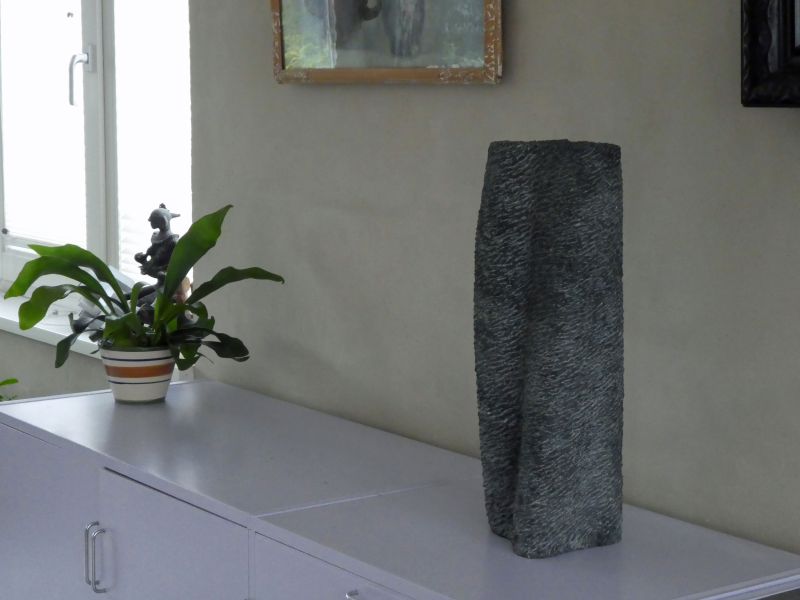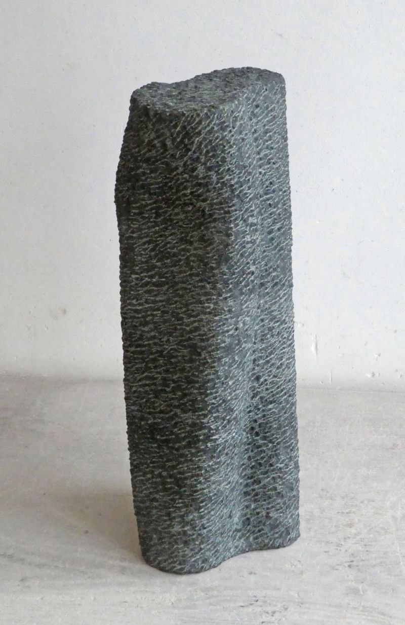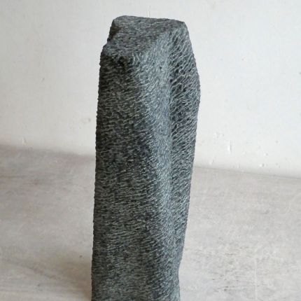 This sculpture is constructed out of two different shapes that mergetogether, into one. It is carved by hand, the traces of the pointed chisel give rhythm and pattern to the surface.