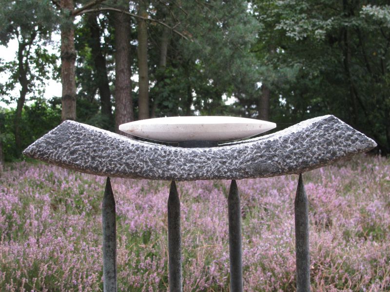The upper part rests loosely on four bronze pillars. It is made of Belgian bluestone, handcarved with a pointed chisel, and on top a light (weather-resistant) limestone. The four bronzes fit into the roughly carved base of the sculpture.