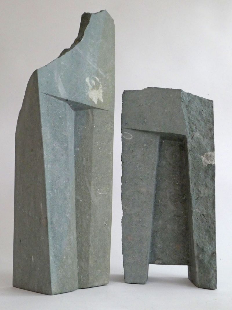 The sculpture is made of Anröchter grünstein, a green-colored sedimentary rock from Germany, where fossils in the form of shells or other plant remains are often visible. You can see that clearly in this sculputure. The dimensions are: part 1 - 52x18x10 cm, part 2 - 38x18x12 cm.