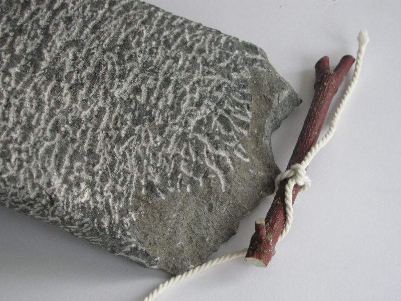 This sculpture is made of Belgium bluestone, carved by hand. The pointed chisel gives a rhythm to the surface. It’s about keeping in balance. The round form on top is kept in place by a rope. The rope runs underneath and is locked by a little twig. They need each other, but are in harmony.