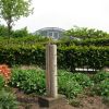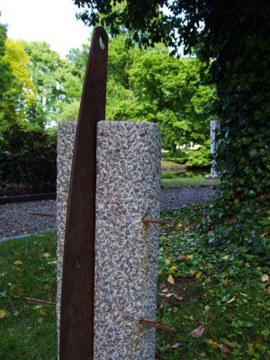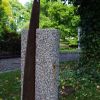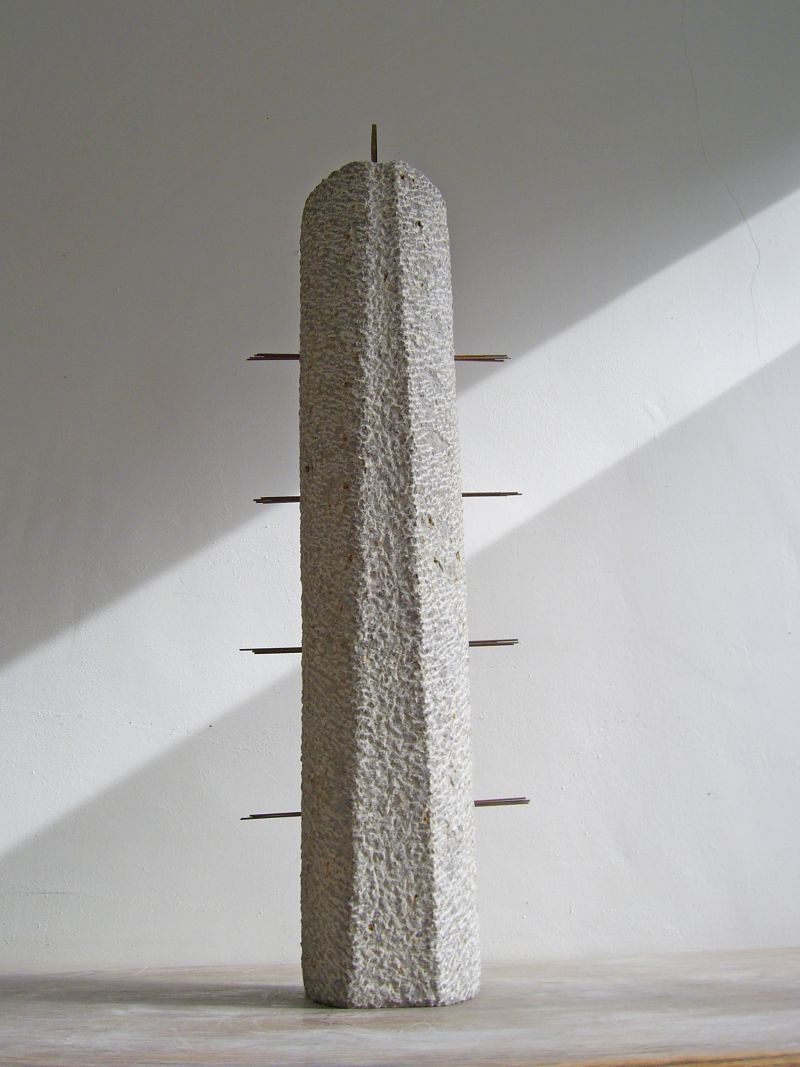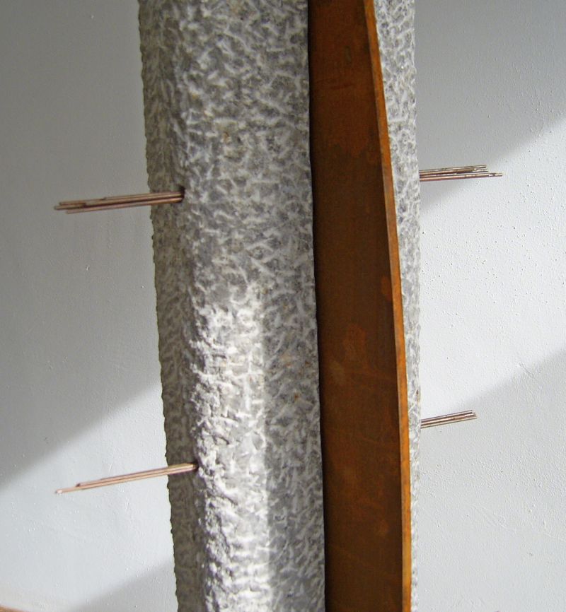 The sculpture is made of a weather-resistantstone (muschelkalk). There are holes in the metal and in the stone, through which are put small metal pins (welding wire, irregular in length) that hold it together.