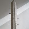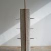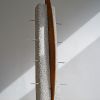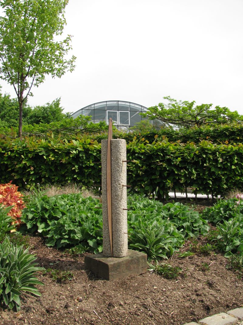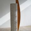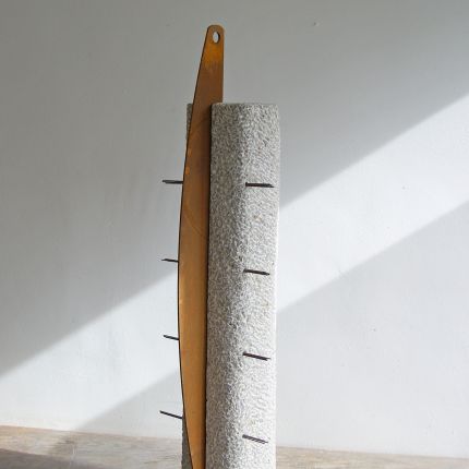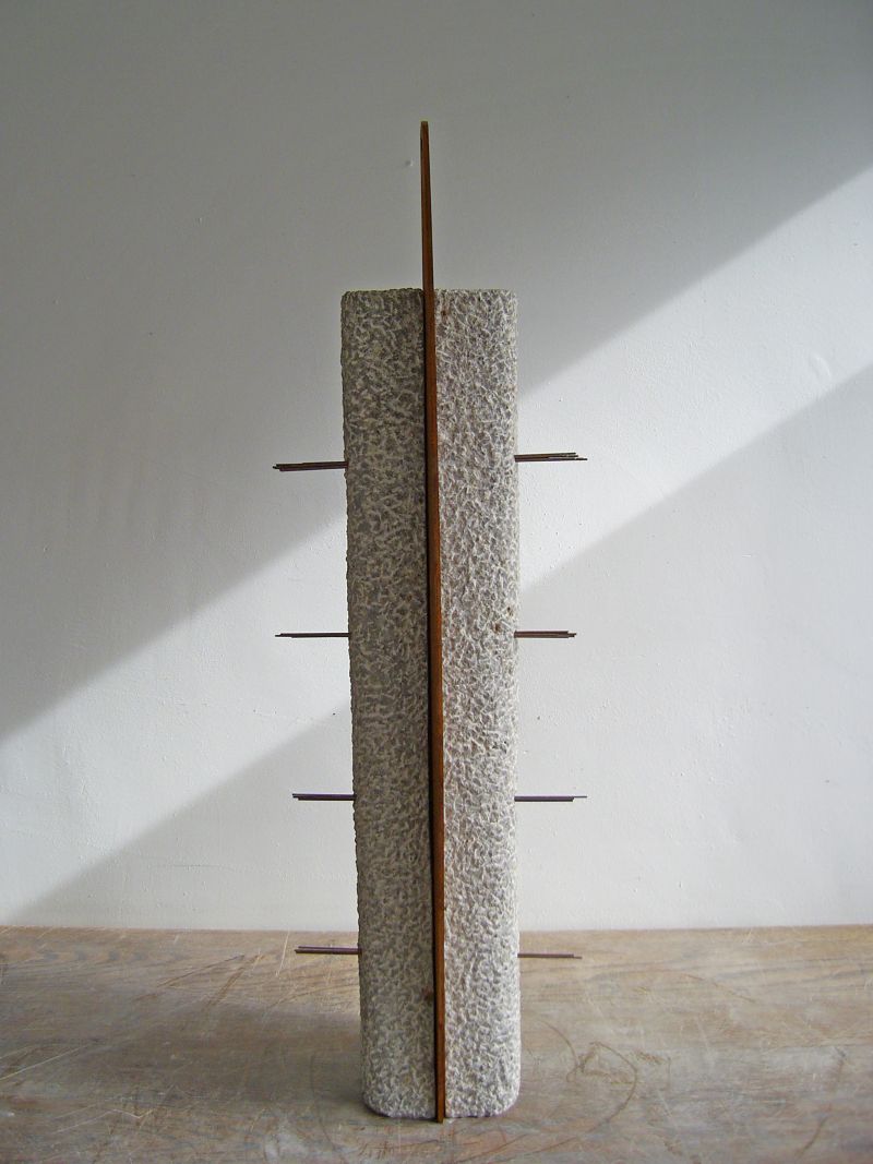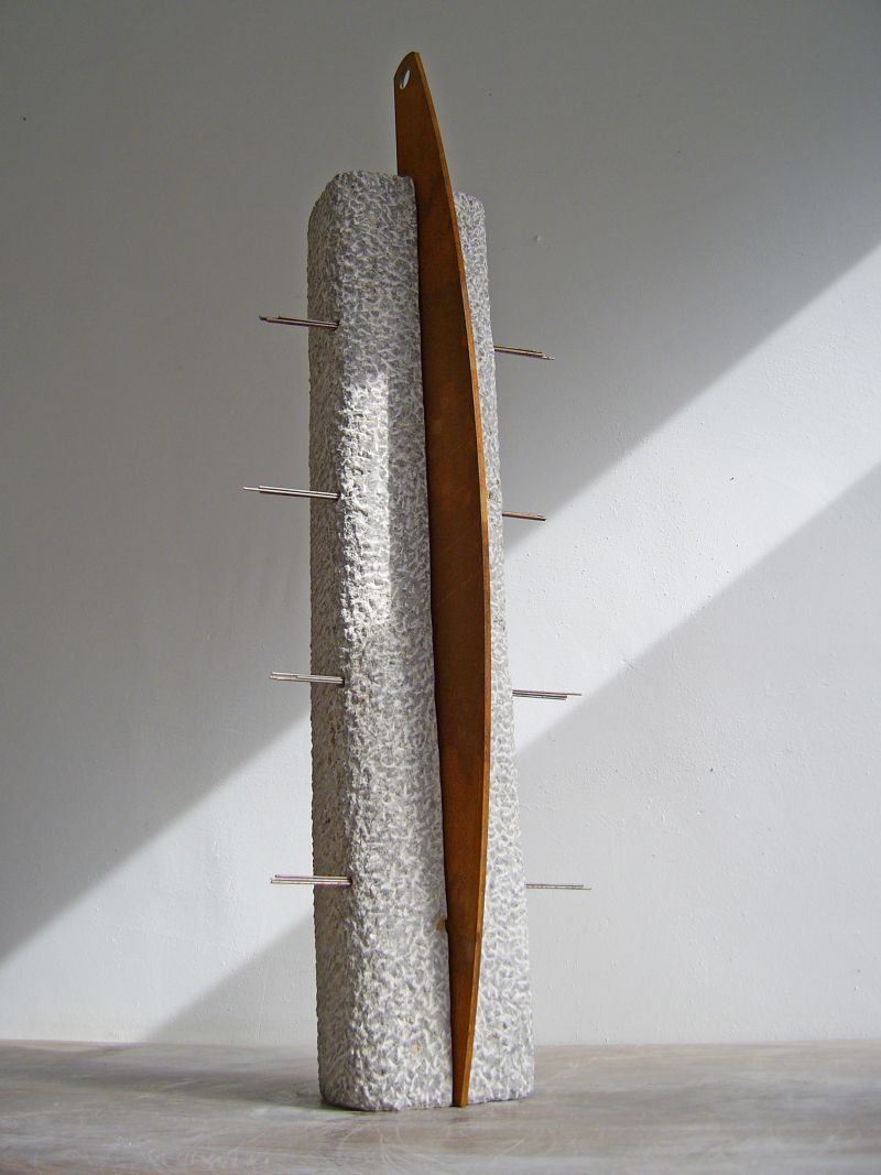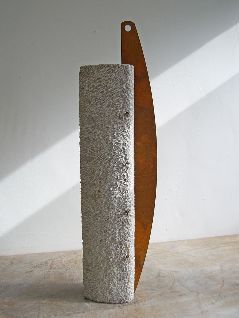 The starting point for this sculpture was the metal blade, made for a cutting machine, but not yet sharpened into a knife. I built the stone (literally) around it. It became a contrast not only in material, but also in shape: sharp and round.