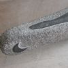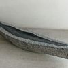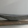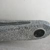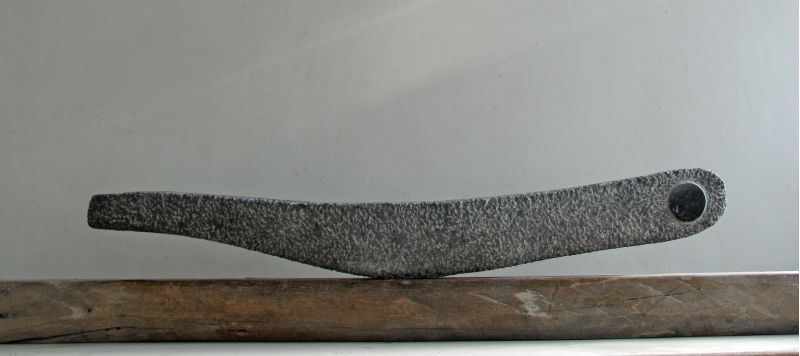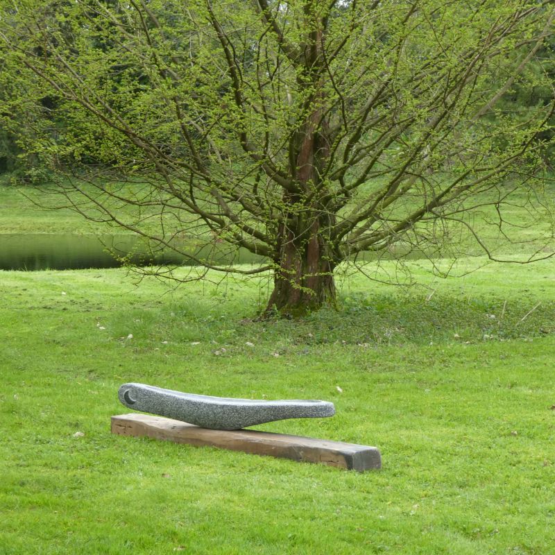 The sculpture I made of Belgian bluestone, partly polished to black. It lies on a sturdy oak beam, this strengthens the form. It has quite a size, 115 cm long, so you need some space for it. Bluestone is also suitable for outdoor use, although the shine of the deep black color will eventually disappear.