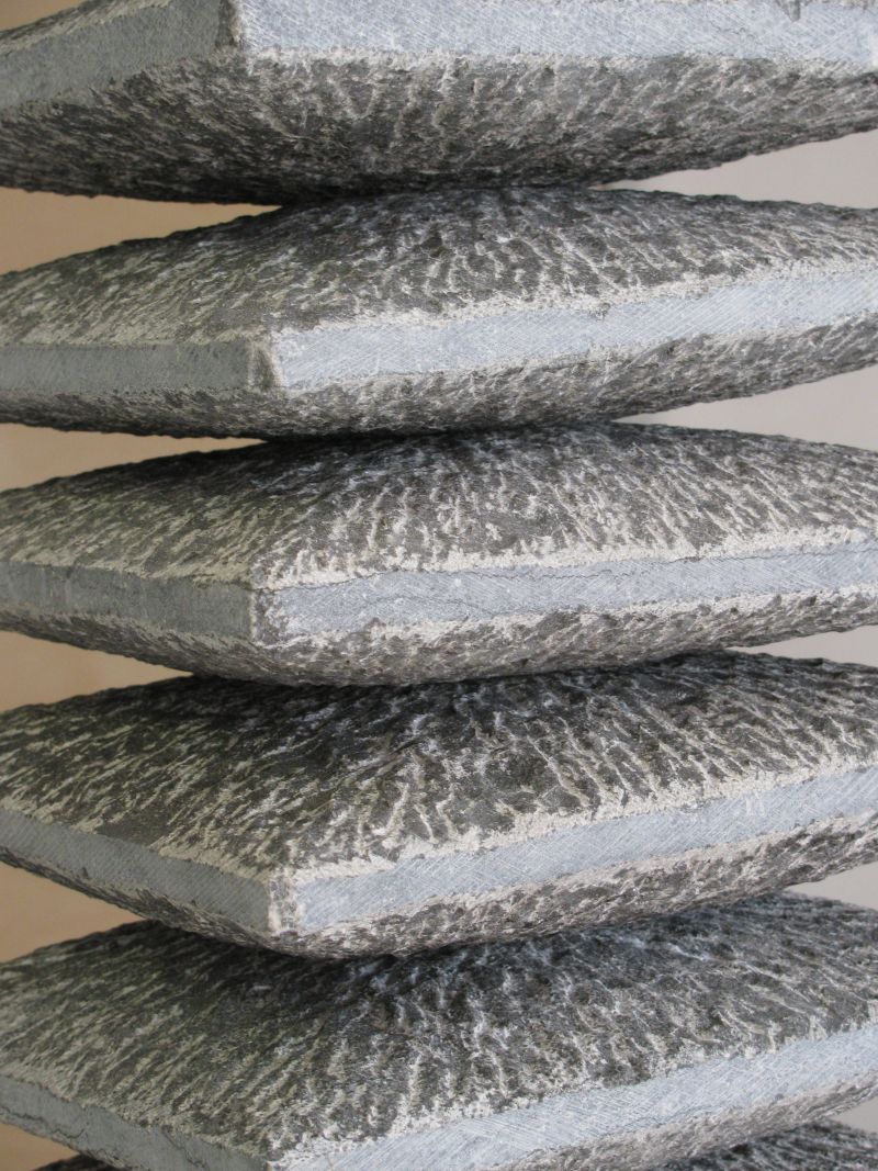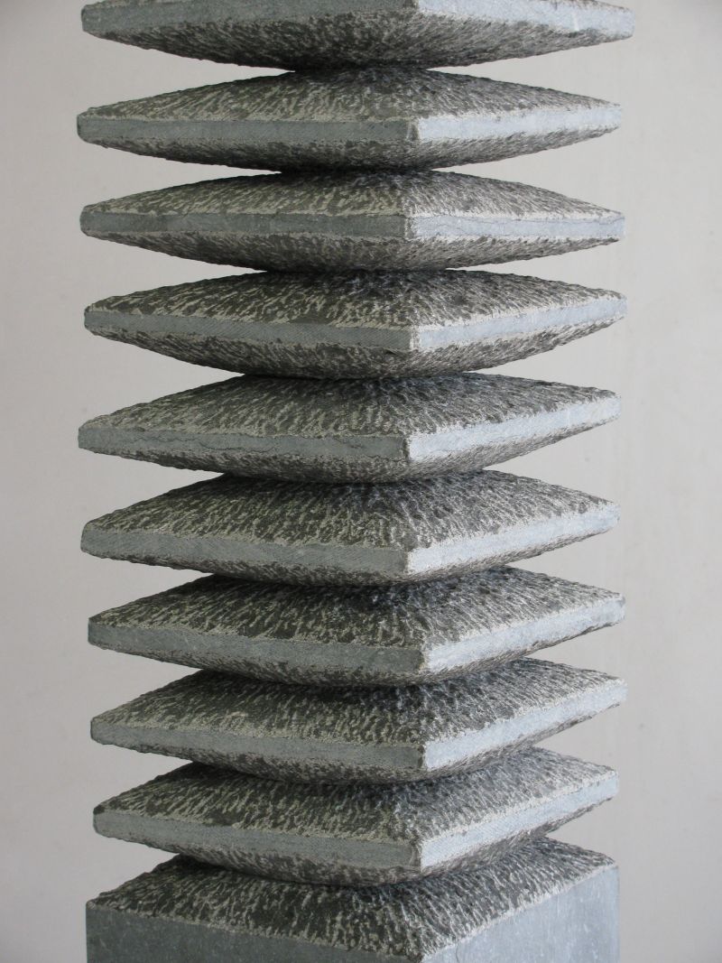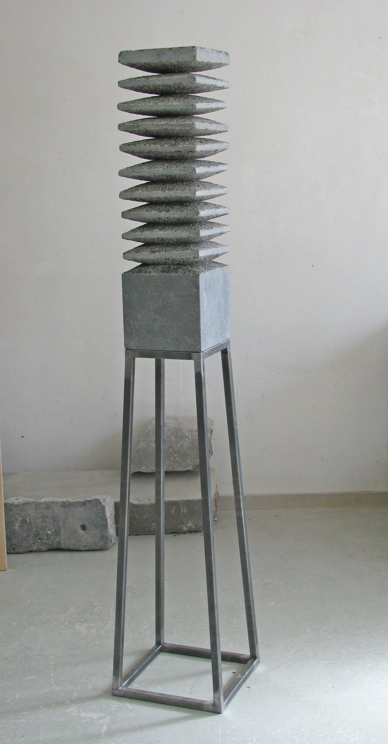 A stack of bluestone tilesinspired me to make this sculpture. I used the rhythm of the stacking, the repetition. By not making everything completely straight, it becomes more lively. The parts that have been cut away are visible in the chisel stroke. The tapered inner shape fits together so well that it seems as if this sculpture is made from one block.