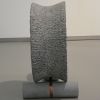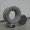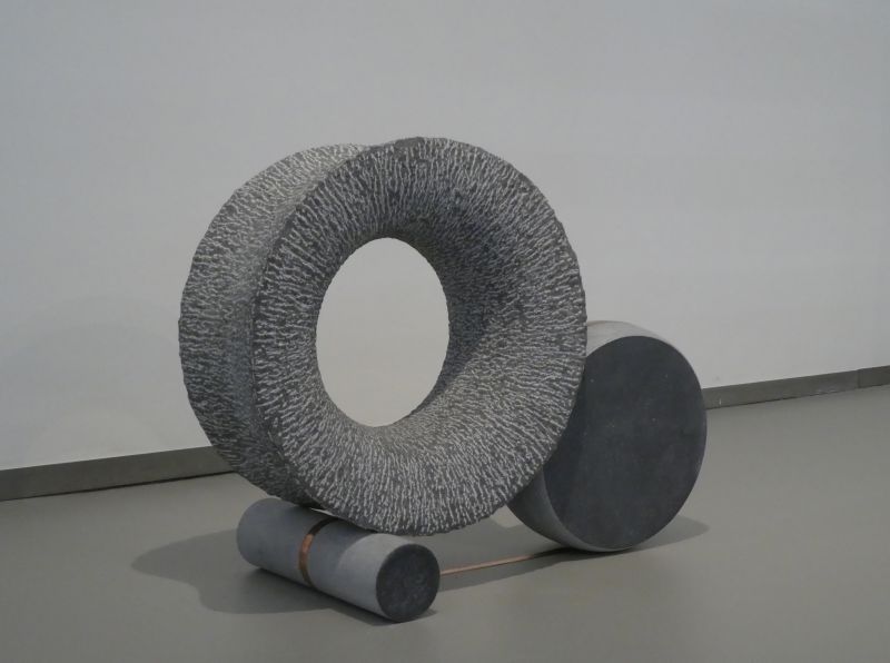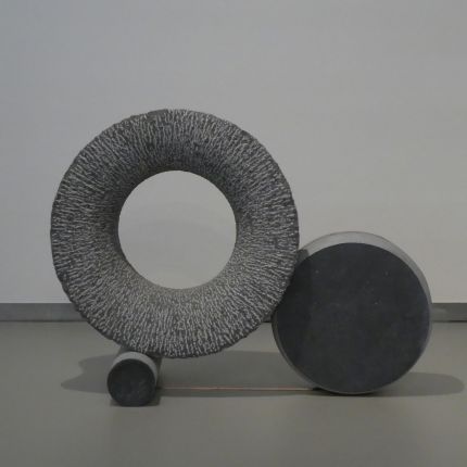 The sculpture is made of Irish bluestone. Partly carved in structure, partly sanded, and the dark part polished.
