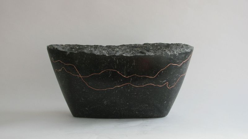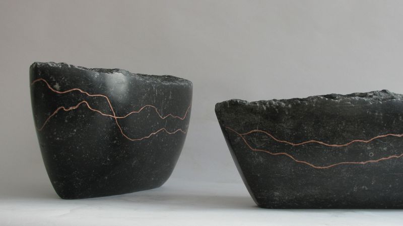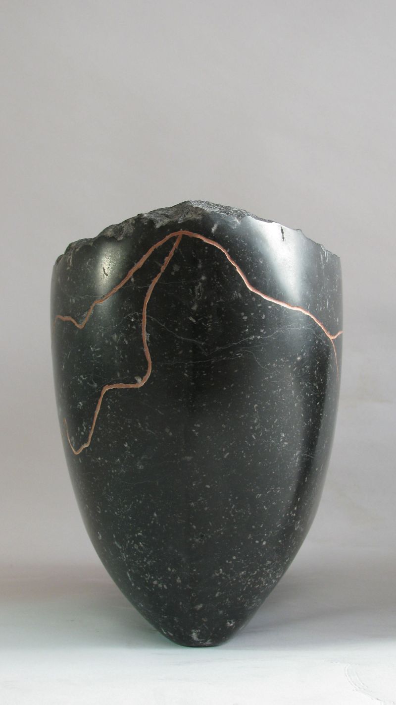 The sculpture is made of Belgian bluestone, polished to a glossy black. The lines, which refer to the erratic course, are engraved in it and filled with copper paint.