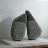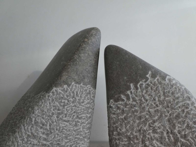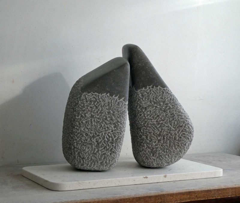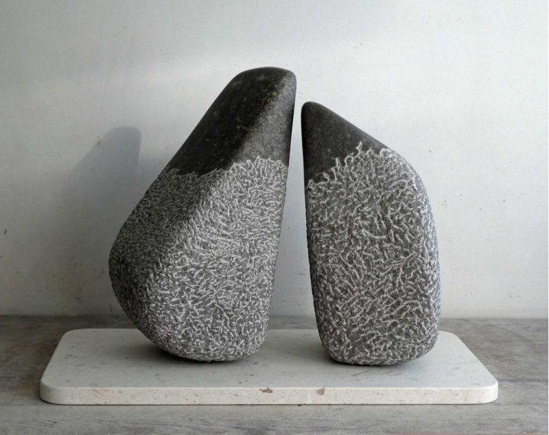 Het zijn twee abstracte vormen, min of meer verwant, maar ook verschillend, die naar elkaar toe neigen. In contact, maar zonder de letterlijke verbinding. Het bovenste deel is glad afgewerkt, als extra accent.