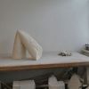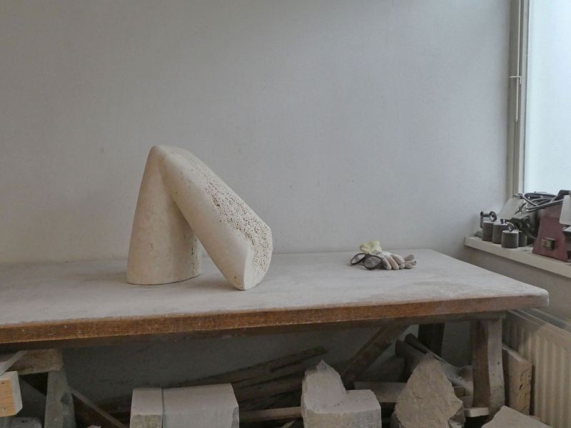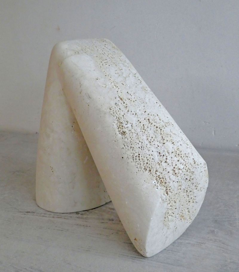 Zodra ik een mooi stuk travertijn zie, wil ik ermee aan de slag. In de steen zelf zit al veel leven, daarom heb ik gekozen voor een eenvoudige vorm met weinig details. Een gebaar: buiging, knik. Aan een kant is dit strak uitgevoerd, aan de andere kant heeft de steen een extra knik.