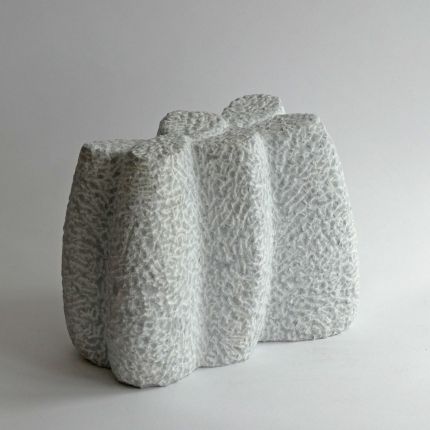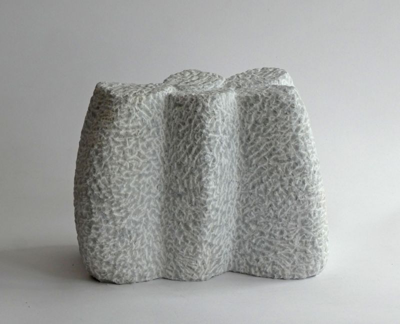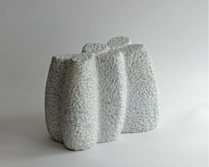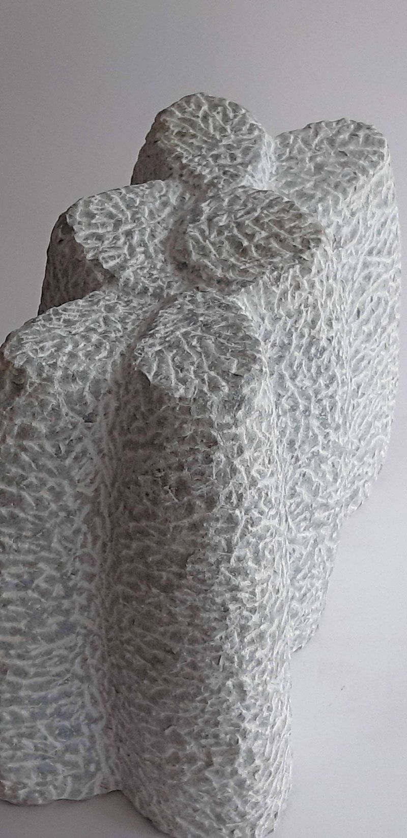 Een klein, intiem beeldje. Gemaakt van een lichtgrijze marmer, waar al eerder in gehakt was. Op die vorm ben ik verder gaan werken. Een groepje, dicht op elkaar. Voortbordurend op eerder thema’s en beelden zoals ‘Gesprek met een steen II’ en de verschillende ‘Companies’. De structuur van de puntbeitel is zichtbaar, het blijft zo een beetje schetsmatig.