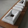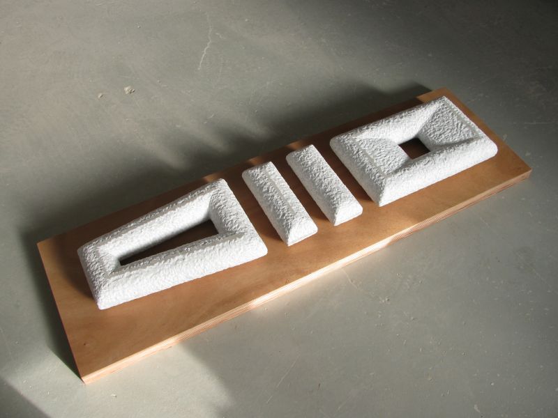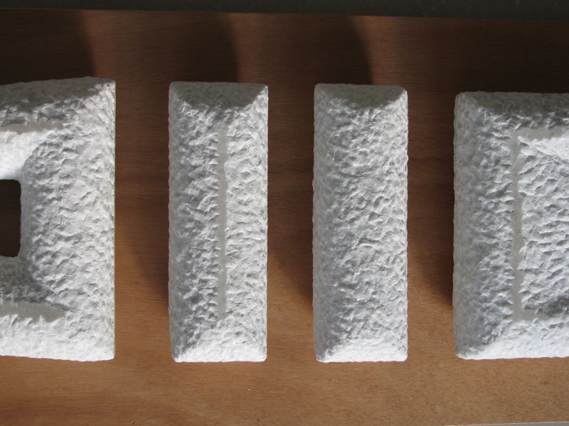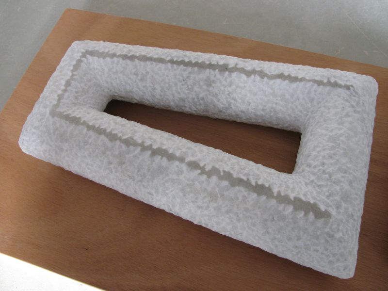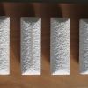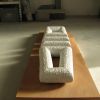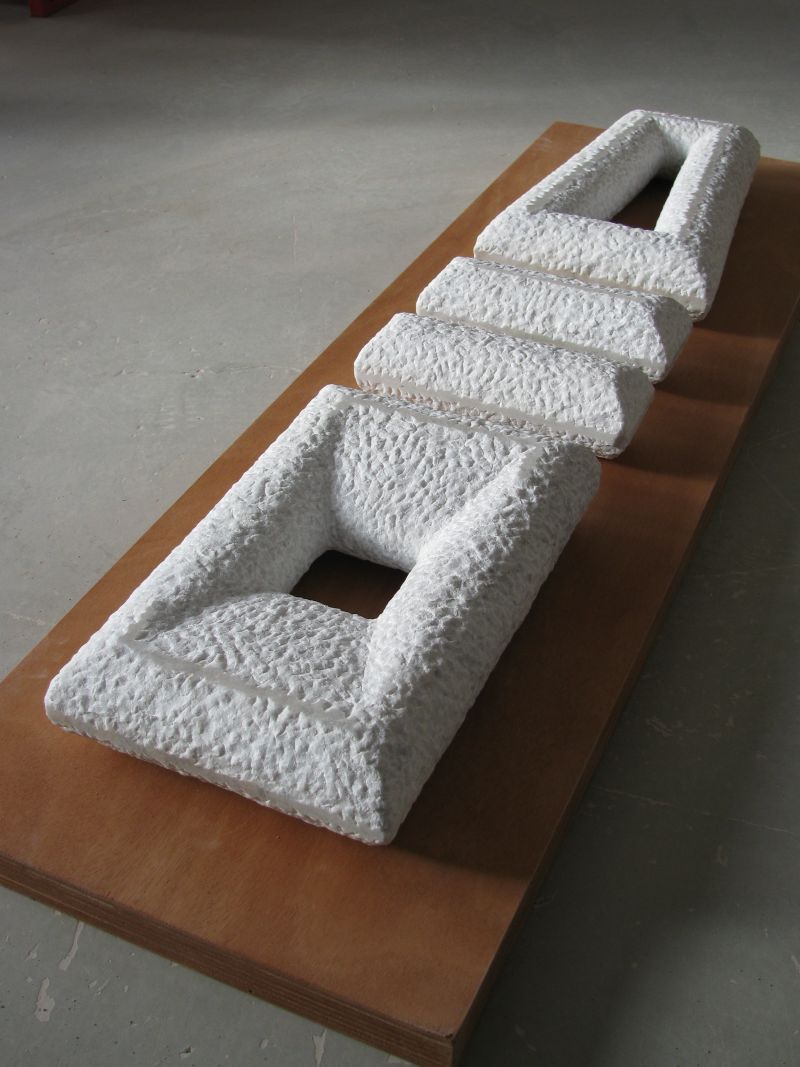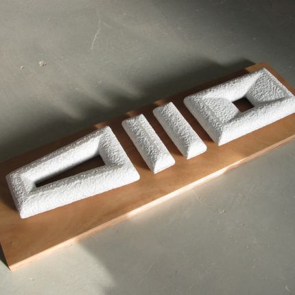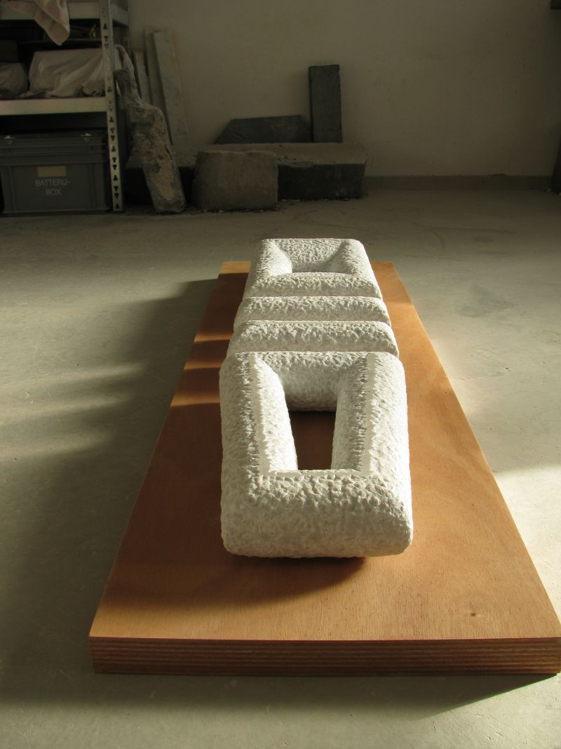 Deze liggende sculptuur moet je van bovenaf zien. Een abstracte compositie van 4 delen, allemaal gemaakt van hetzelfde witte marmer. Met de hand gehakt met de puntbeitel, dat geeft een structuur aan het oppervlak.