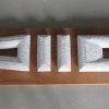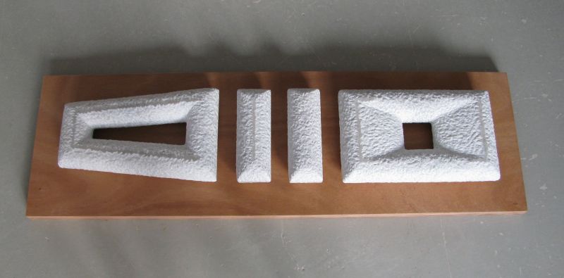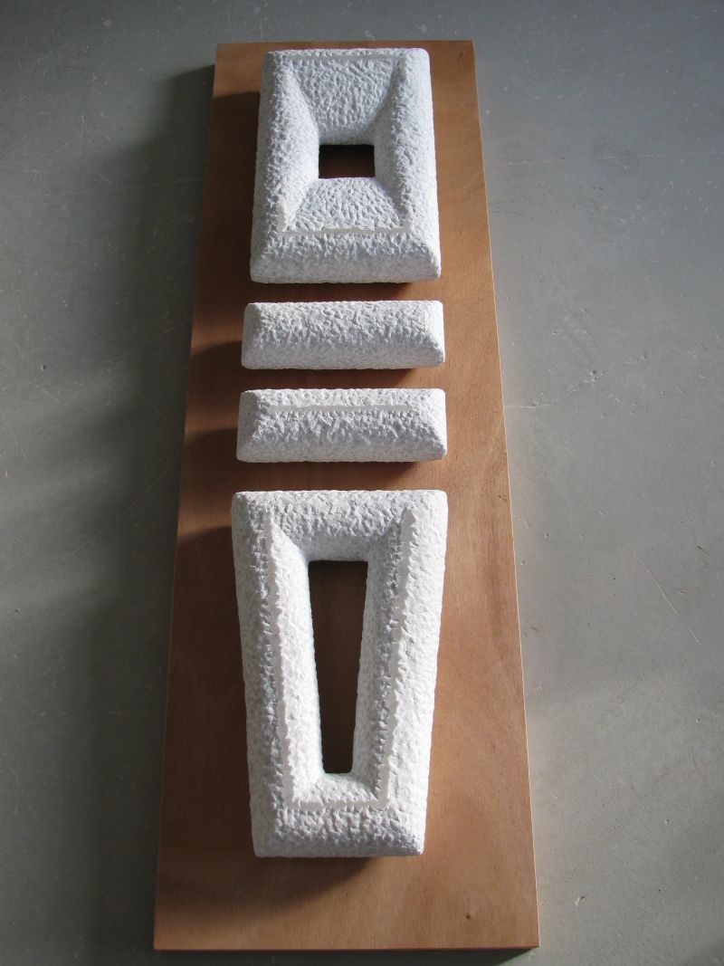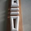 Deze liggende sculptuur moet je van bovenaf zien. Een abstracte compositie van 4 delen, allemaal gemaakt van hetzelfde witte marmer. Met de hand gehakt met de puntbeitel, dat geeft een structuur aan het oppervlak.