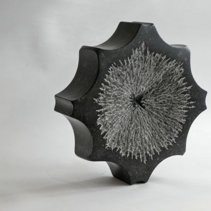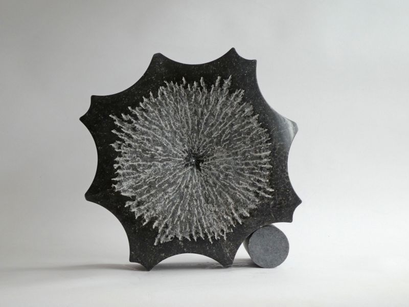 Ik werk regelmatig met restanten, de ongebruikelijke vormen brengen je vaak tot nieuwe ideeën. Dit beeld is opgebouwd uit vier losse stukken hardsteen, afkomstig van een steenhouwerij. De vele holle rondingen – een restvorm van het maken van boorgaten – waren onvermijdelijk en beeldbepalend. De vier delen zijn met elkaar verlijmd (van dichtbij zie je dit nog steeds). In het midden valt een speldenknopje licht.