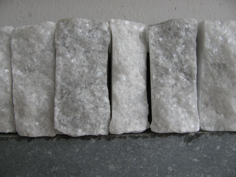 Ruw gebroken stukken steen, en zeker marmer, vind ik vaak erg mooi. Het marmer uit dit beeld heeft een grove krisallijn met mooie schittering, in witte en grijze tinten.
