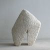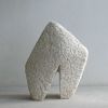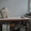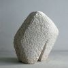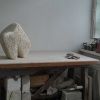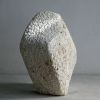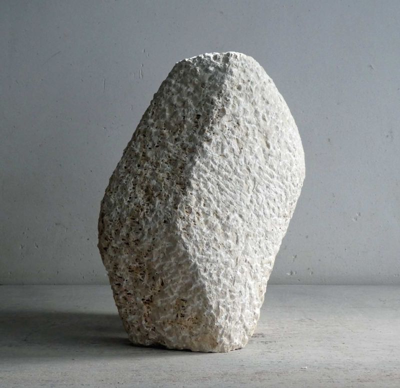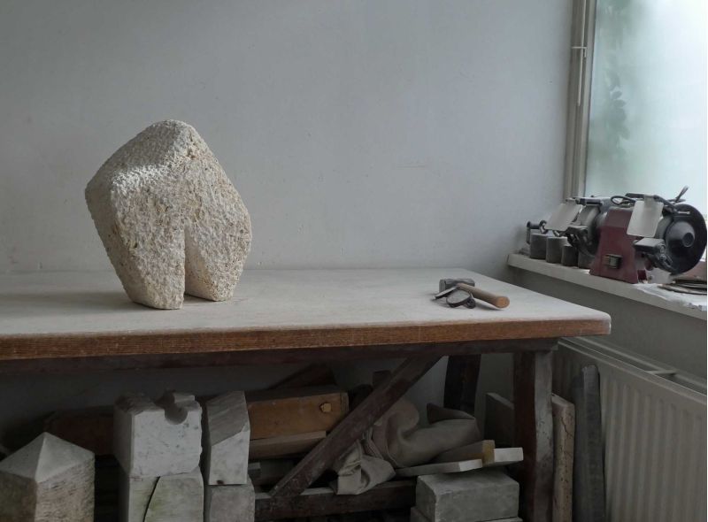 Dit beeld begon met een gedeeltelijk schuin afgezaagd stuk travertijn dat al jaren in mijn atelier stond. Behoorlijk groot van formaat (voor mijn doen). Ik wilde een robuust beeld maken, met een kleine beweging. De basis was er snel. Maar het werd toch een hele zoektocht om te krijgen wat ik wilde. En zo werd dit beeld gedurende het proces heel wat kilo’s lichter. Inmiddels staat het, stevig en stoer.