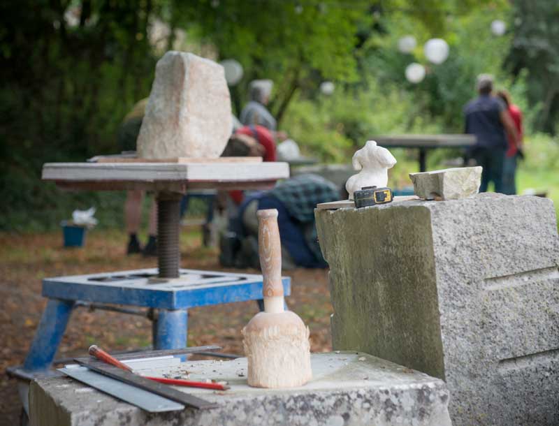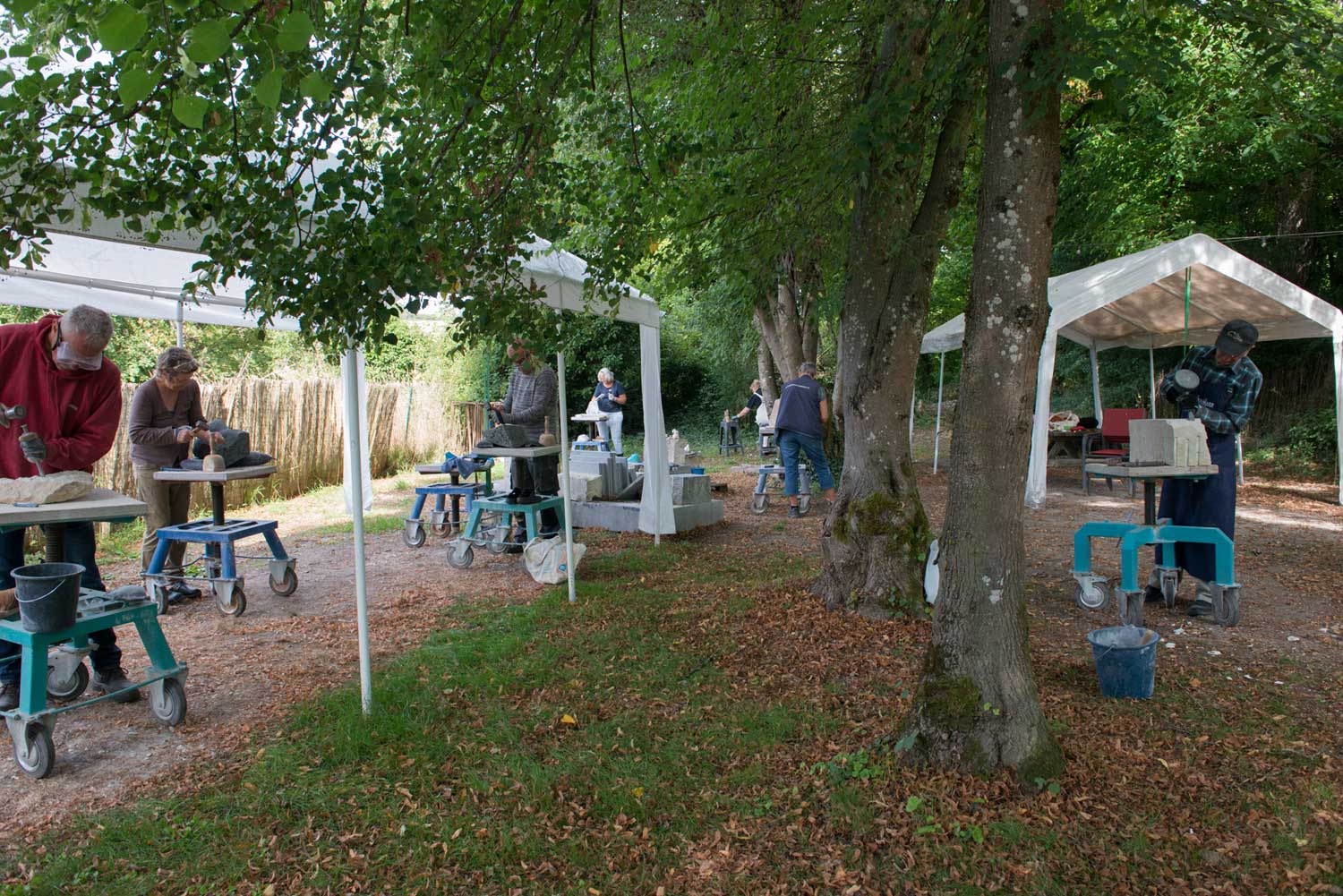 Château Melay is een inspirerende locatie voor een beeldhouwcursus. Er wordt buiten gewerkt, onder de eeuwenoude bomen, in de zon, of onder een tent.