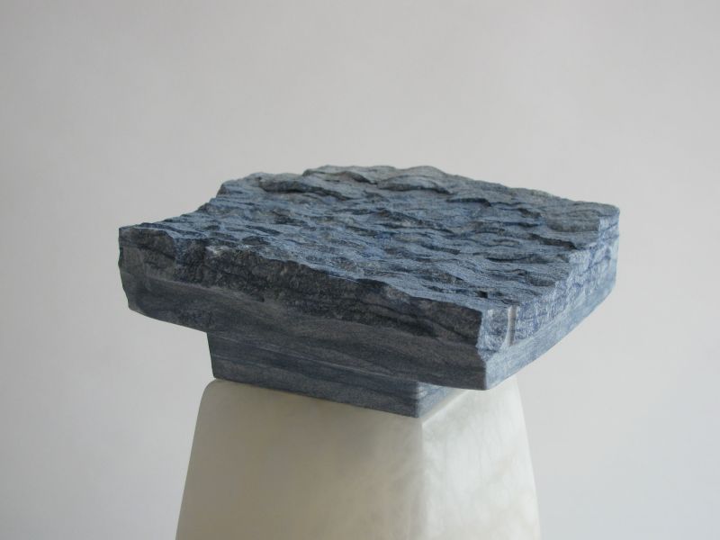 This sculpture started with a little piece of broken blue marble, a beautiful structure in a soft blue color. It fitted well with the slightly transparent, cloudy alabaster.