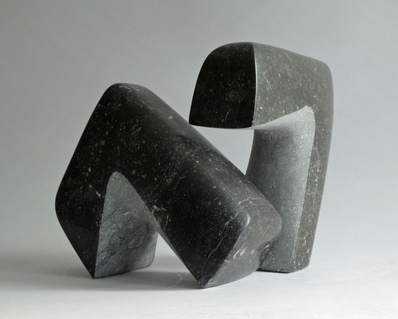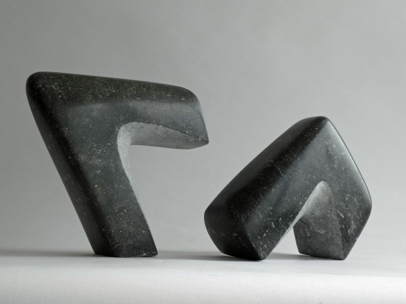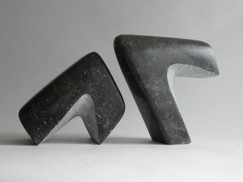 Thisabstract andminimalsculpture is made of tworelated pieces ofBelgium bluestoneClear, but with soft curves. Part of thestone is polishedto black. Youcanarrangethe in different positionsdepending on thecircumstancesandyour taste. To keep the black partspolishedandshinyonly put itindoors.