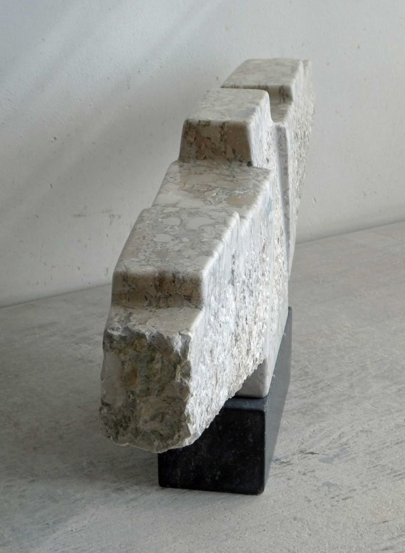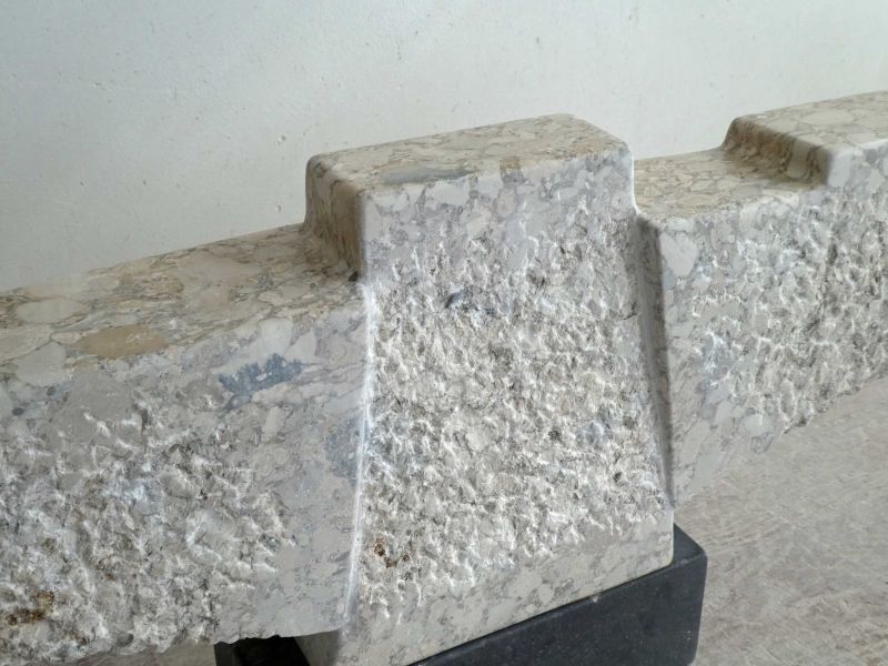 Breccia is a clastic sedimentary rock. This means that it is formed from larger fragments of pre-existing rock that are cemented together after weathering, erosion and deposition. In this sculptrue you can see both the structure of the chisel stroke and the skin after polishing. It has a beautiful, warm, light colour, with many nuances.