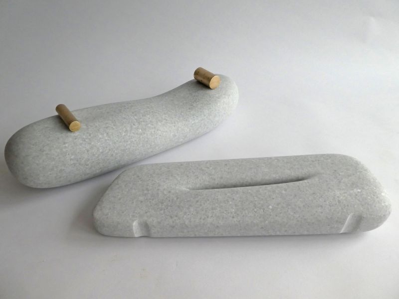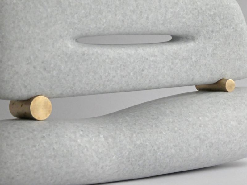 This abstract, indoor sculpture is made of marble with goodvisable crystals, in a light gray colour. It's a smooth form, made of two parts, connected by little bronzes. It's originated intuitively, working, changing, untill the right balance was found.