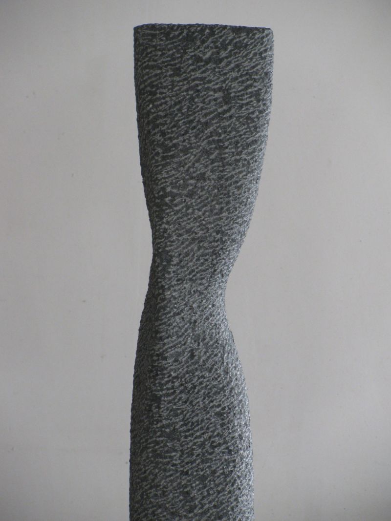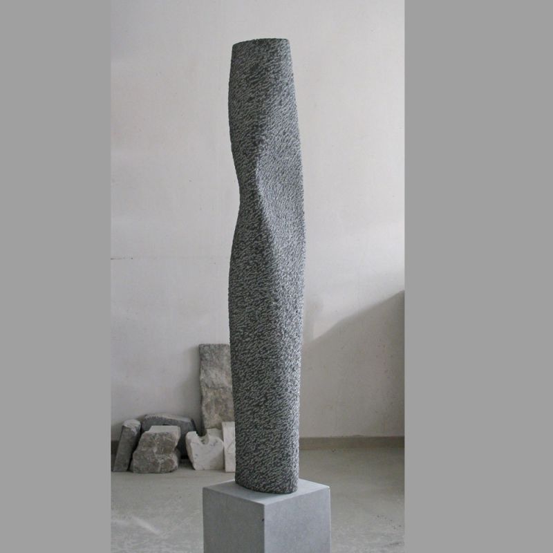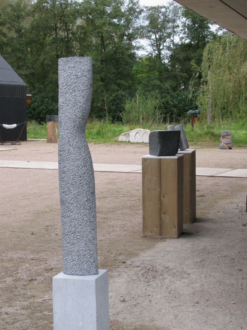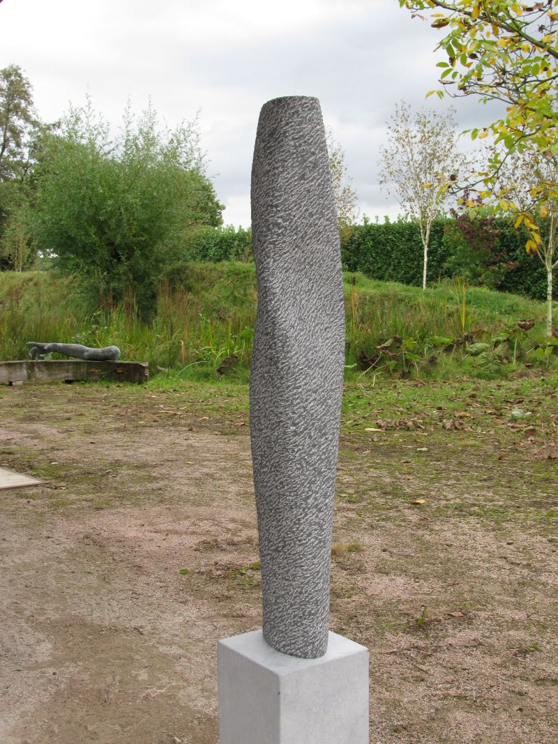 I regularly make sculpturesinspired on a small movement, rotation or bend (see also my sculptures "Fier" and "Whispering"). While working, such a sculpture remains formless for quite a long time. It only comes to life when there is good tension on the surfaces. Nice to work towards that. And although this sculpture is quite large, everything is carved by hand. It is made from Celtic brown, a brown-gray Irish bluestone. Suitable for outdoor use.