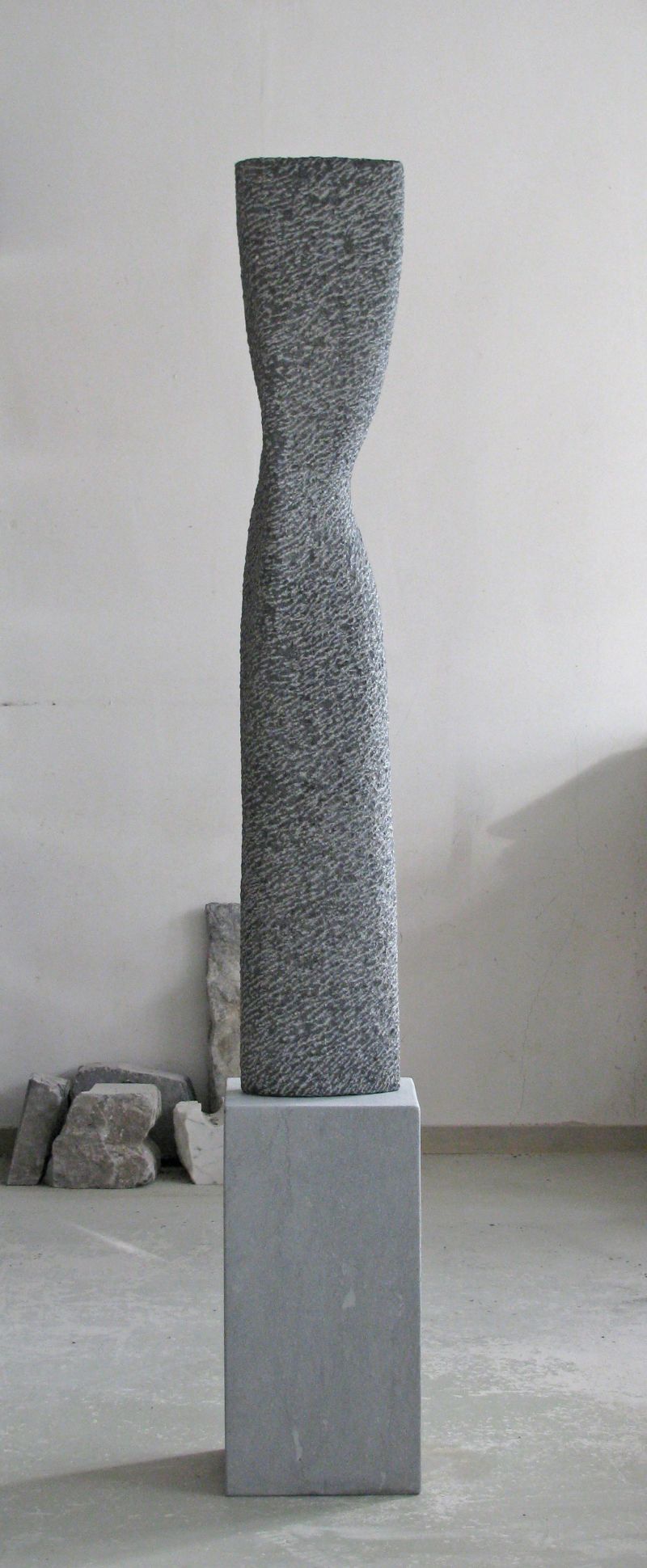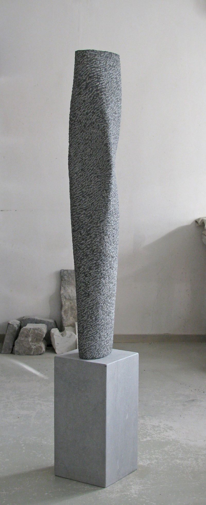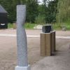 I regularly make sculpturesinspired on a small movement, rotation or bend (see also my sculptures "Fier" and "Whispering"). While working, such a sculpture remains formless for quite a long time. It only comes to life when there is good tension on the surfaces. Nice to work towards that. And although this sculpture is quite large, everything is carved by hand. It is made from Celtic brown, a brown-gray Irish bluestone. Suitable for outdoor use.