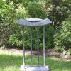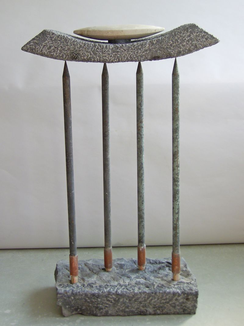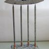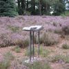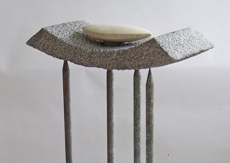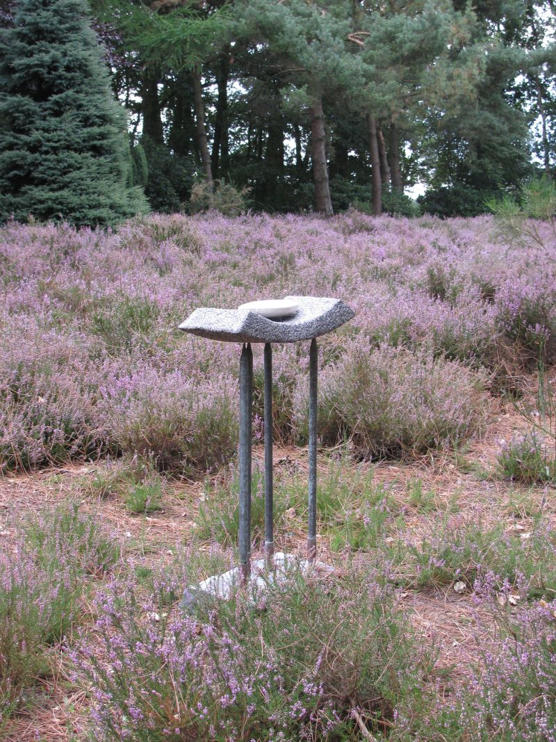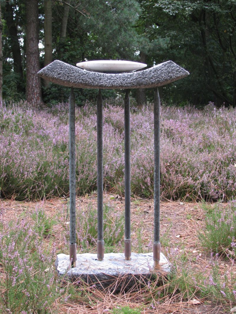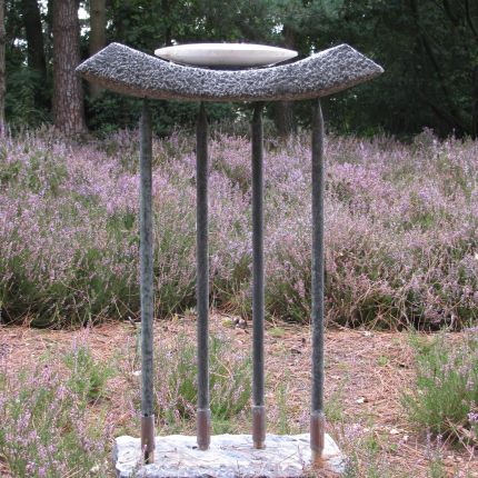 The upper part rests loosely on four bronze pillars. It is made of Belgian bluestone, handcarved with a pointed chisel, and on top a light (weather-resistant) limestone. The four bronzes fit into the roughly carved base of the sculpture.