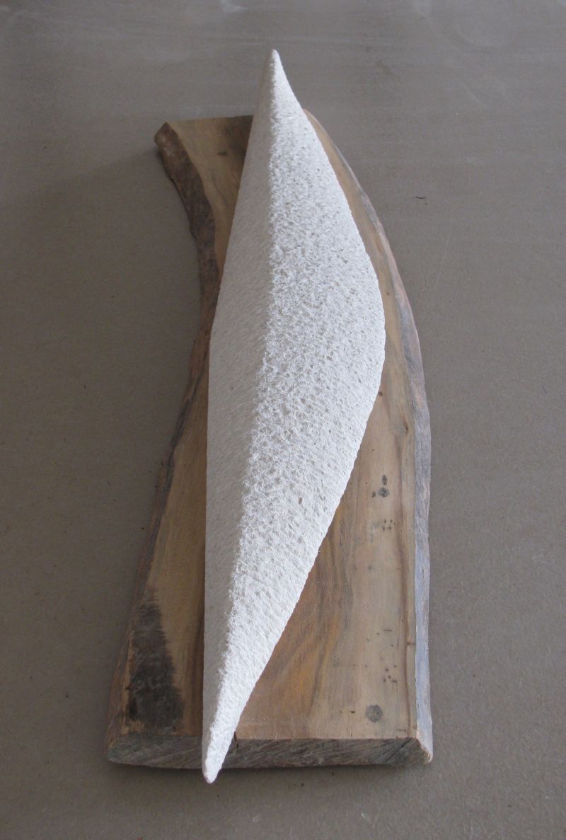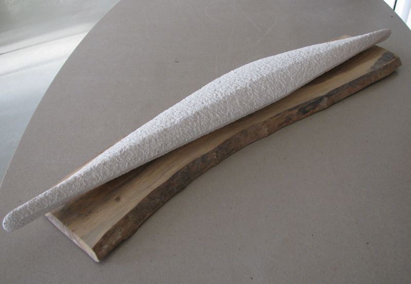 A long slender shape made of a light colored limestone. Subtly carved by hand with the pointed chisel. Narrow ends, pointed from above, round seen from the side.