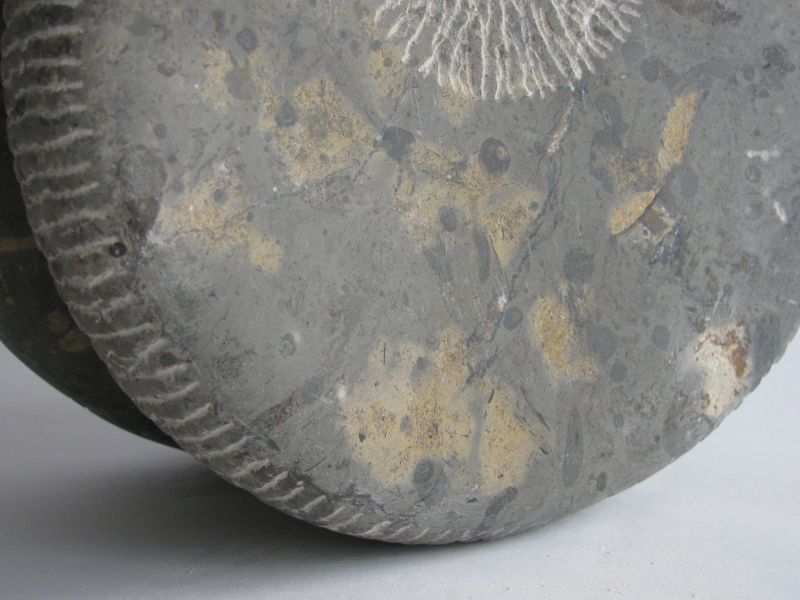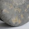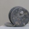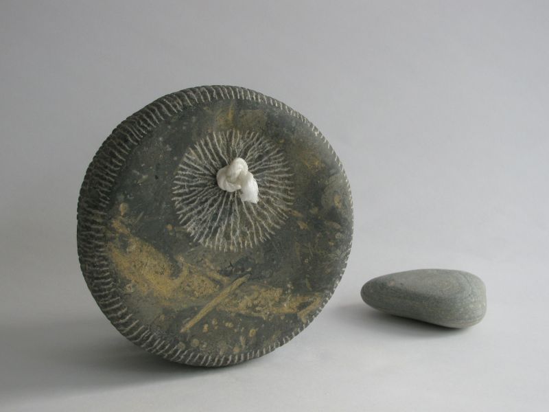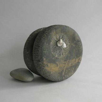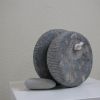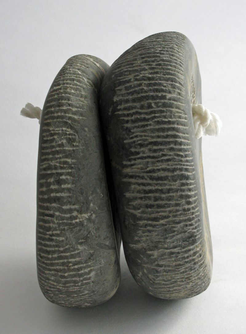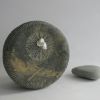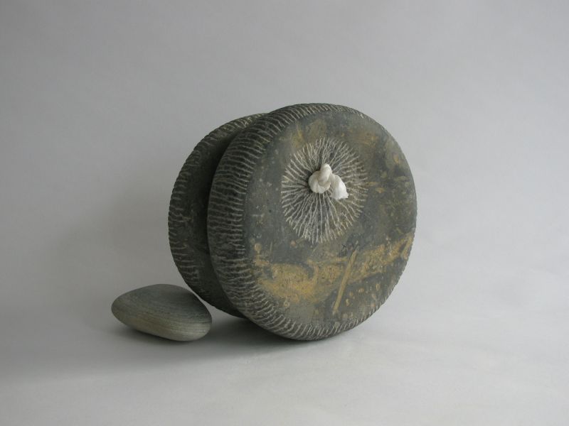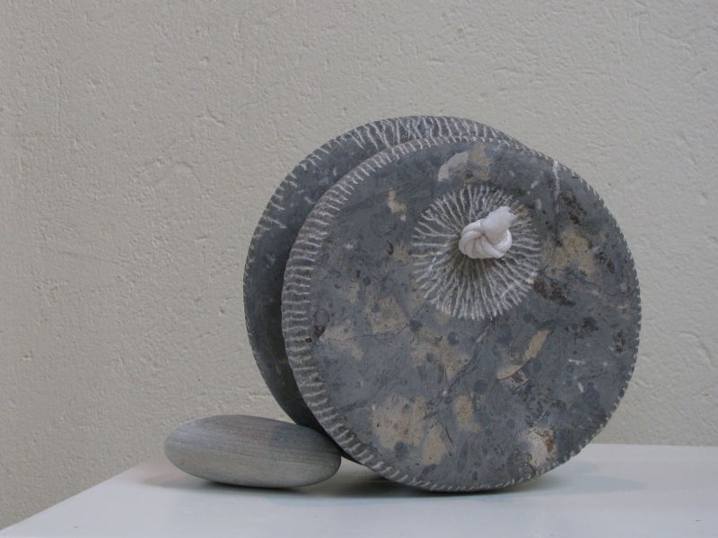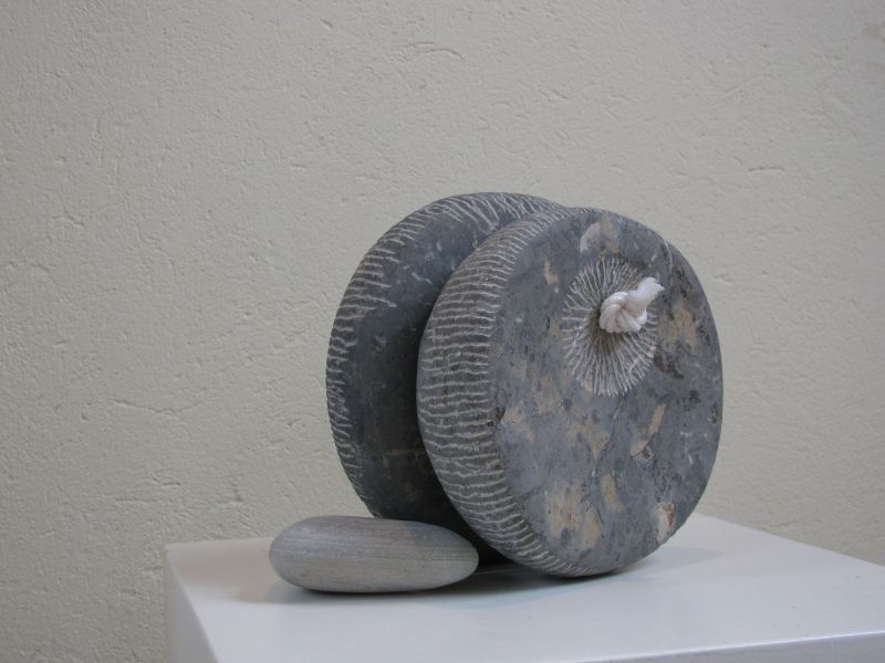 Playing with shapes and stones remains fun. This is how this sculpture arose. It's made of a very special French bluestone, you can see the remains of the inclusions. The two parts are connected by a little rope. It can roll, but also stays in place. An interplay.