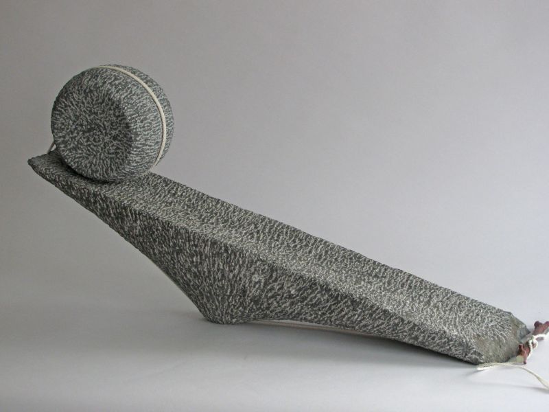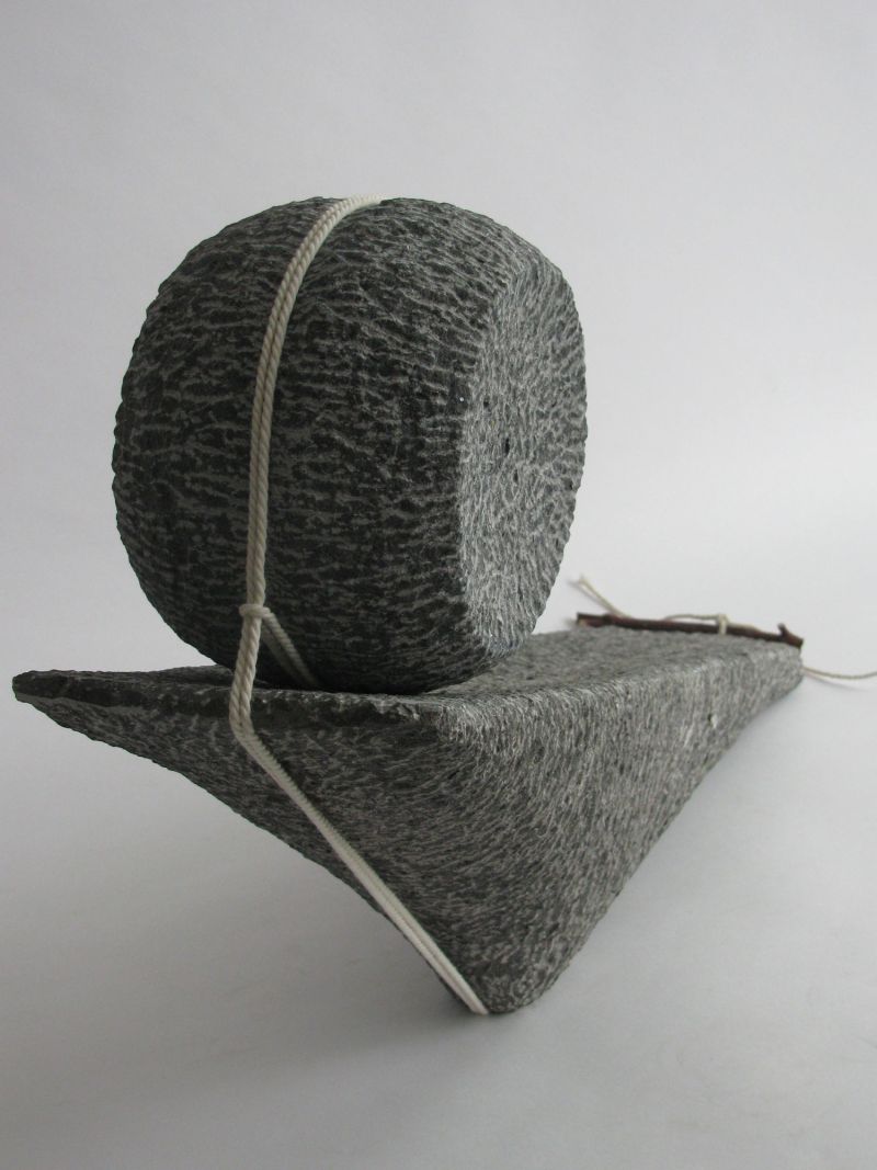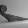 This sculpture is made of Belgium bluestone, carved by hand. The pointed chisel gives a rhythm to the surface. It’s about keeping in balance. The round form on top is kept in place by a rope. The rope runs underneath and is locked by a little twig. They need each other, but are in harmony.
