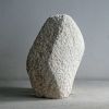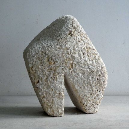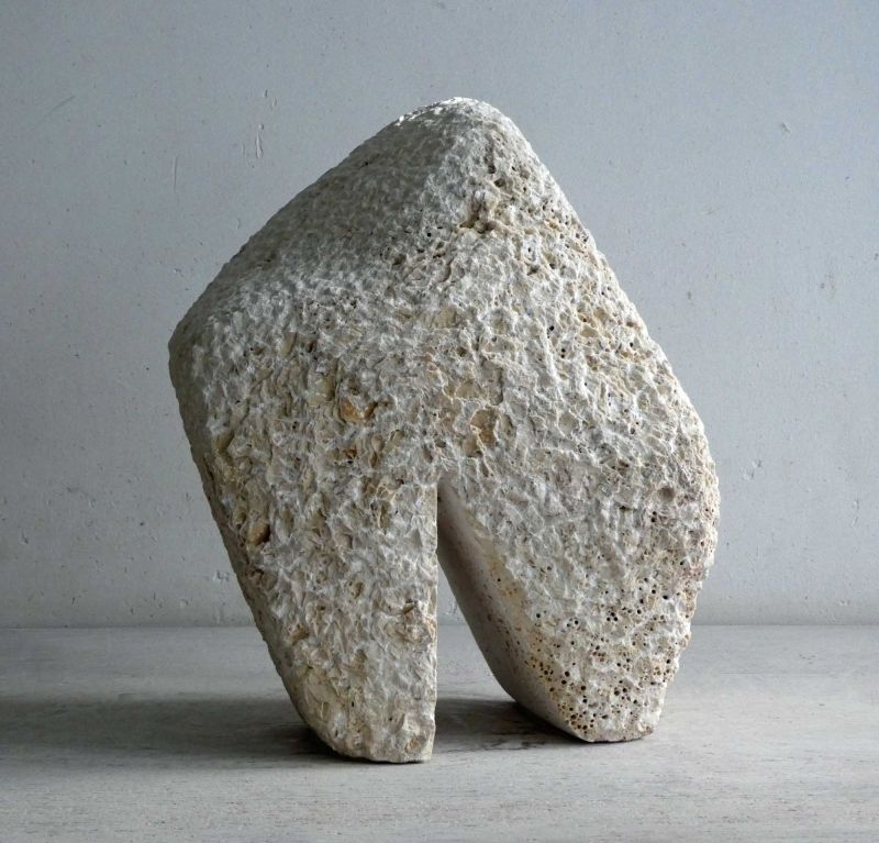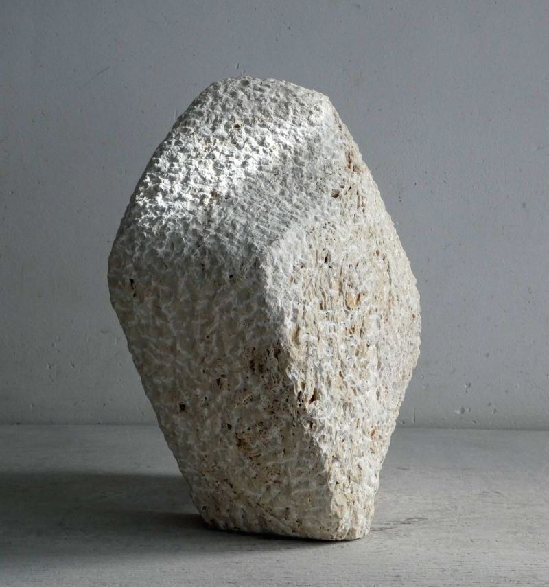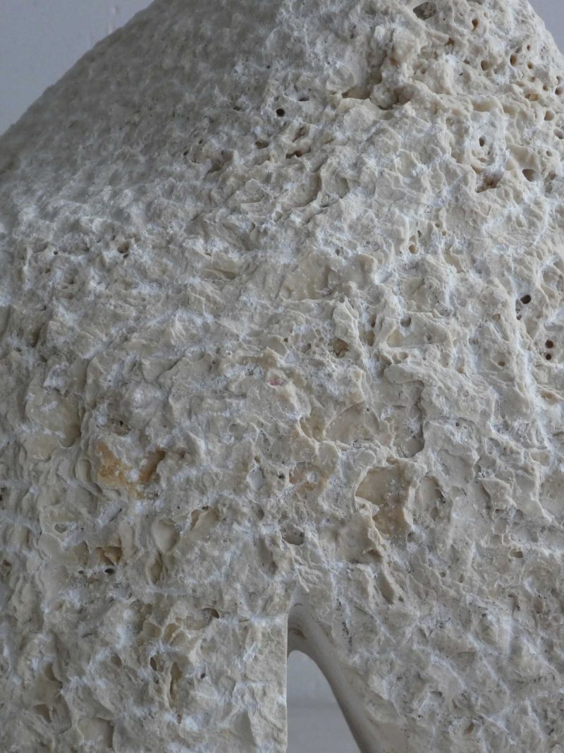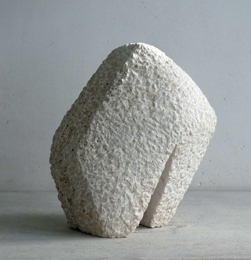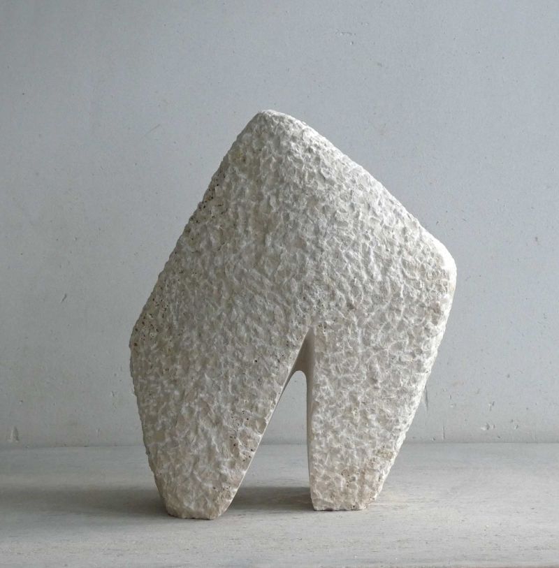 This sculpture started with a partially beveled piece of travertine that had been in my studio for years. Quite large in size (for me). I wanted to make a robust form, with a small movement. The basis was there quickly. But it turned out to be quite a quest to get what I wanted. And so this stone sculpture became many kilos lighter during the process. It is now standing, solid and sturdy.