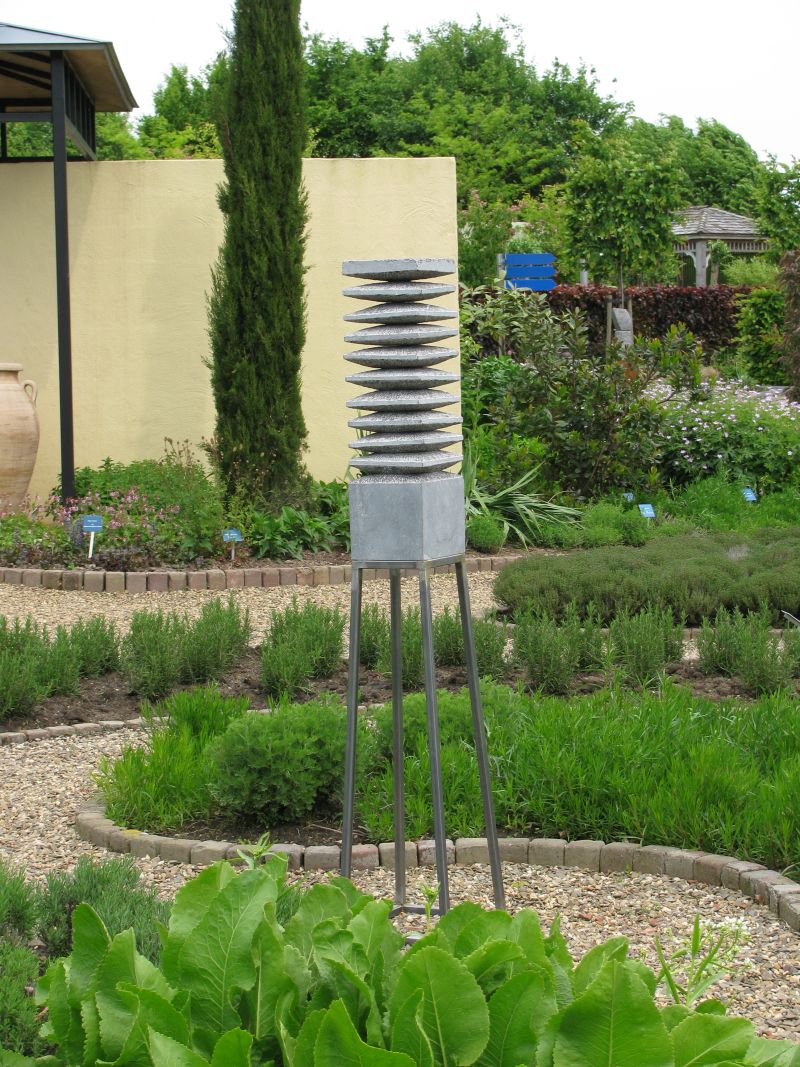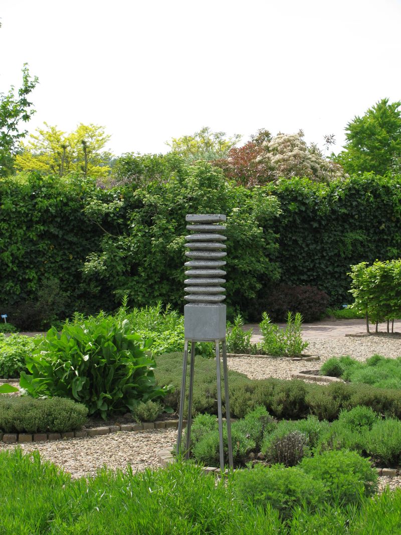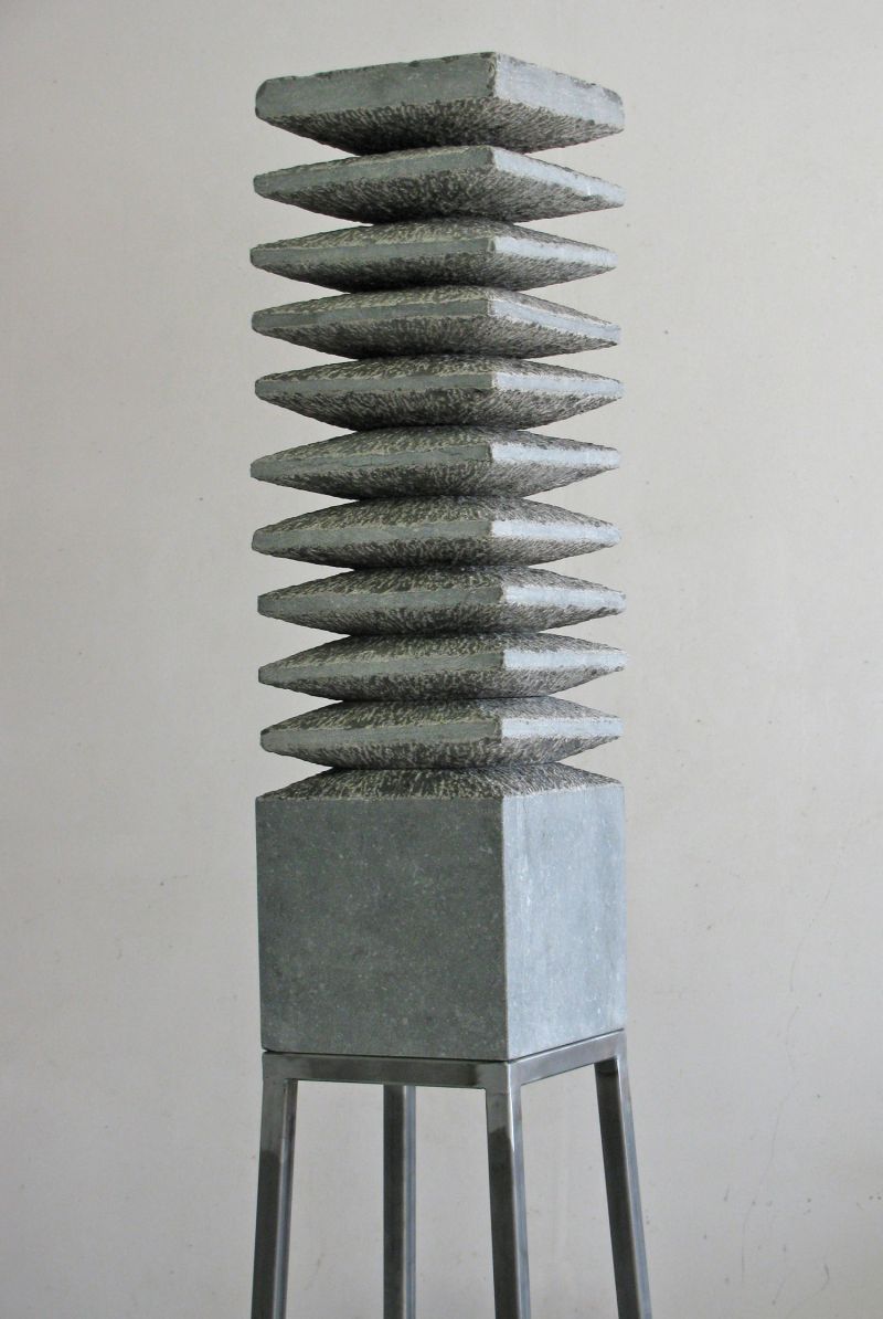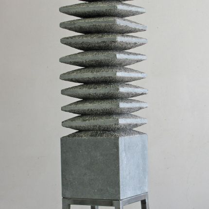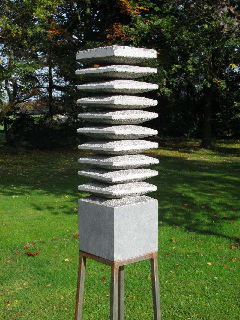 A stack of bluestone tilesinspired me to make this sculpture. I used the rhythm of the stacking, the repetition. By not making everything completely straight, it becomes more lively. The parts that have been cut away are visible in the chisel stroke. The tapered inner shape fits together so well that it seems as if this sculpture is made from one block.