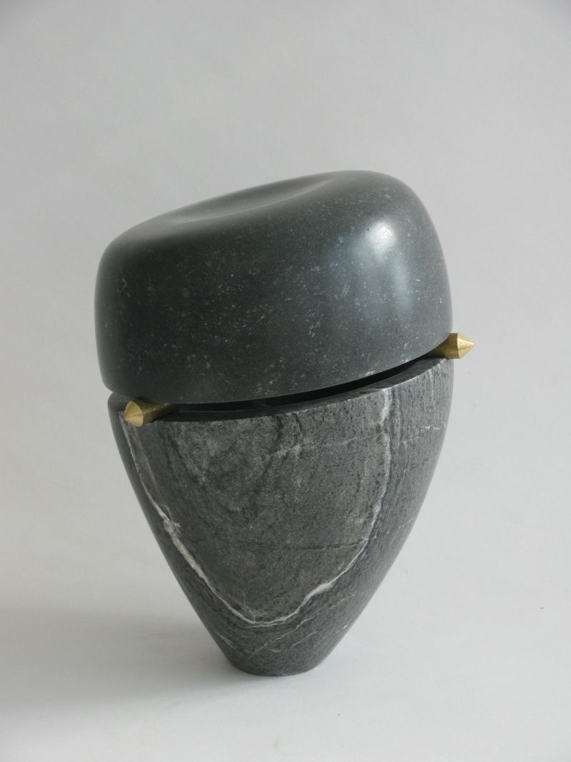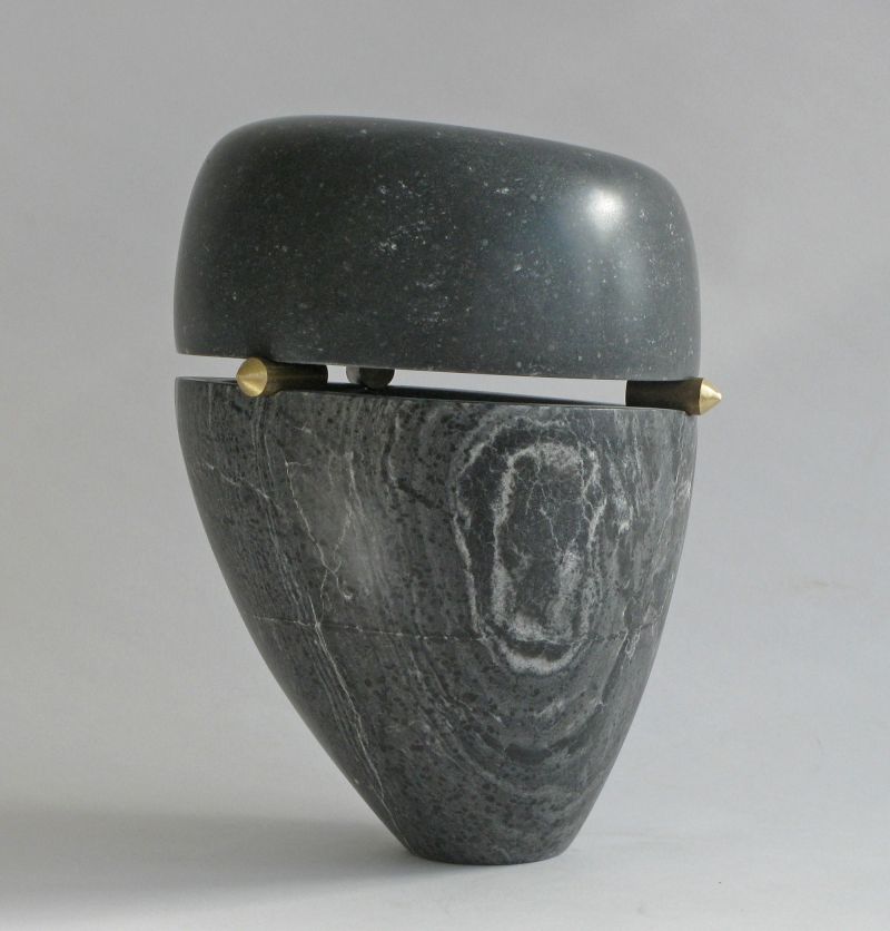 Dit beeld bestaat uit twee delen, gemaakt van verschillende soorten steen: albast en hardsteen. De huid van de albast doet denken aan donkere wolken; het bovenste deel van hardsteen heeft kleine fossieltjes, als sterretjes in het donker. De verbindende stukjes zijn van brons. Minimalistische, en door de holle binnenruimte, met een beetje mysterie.