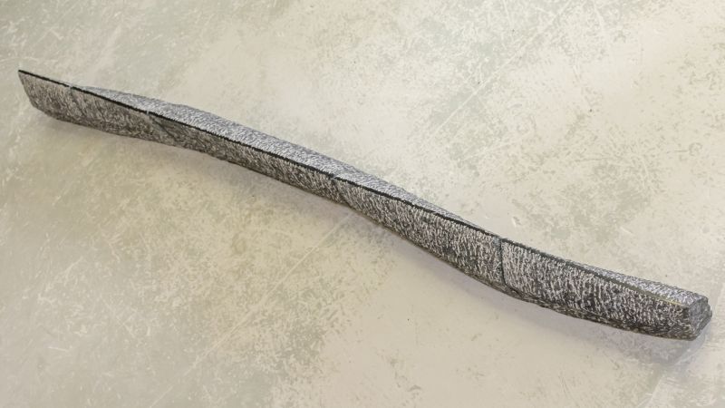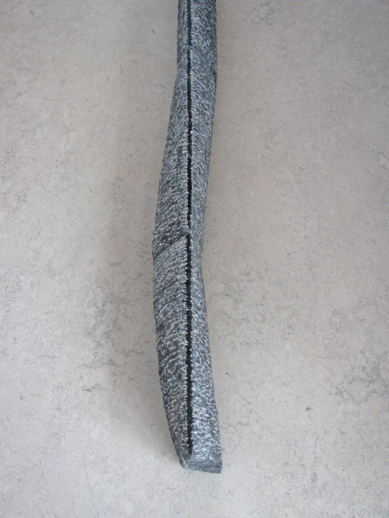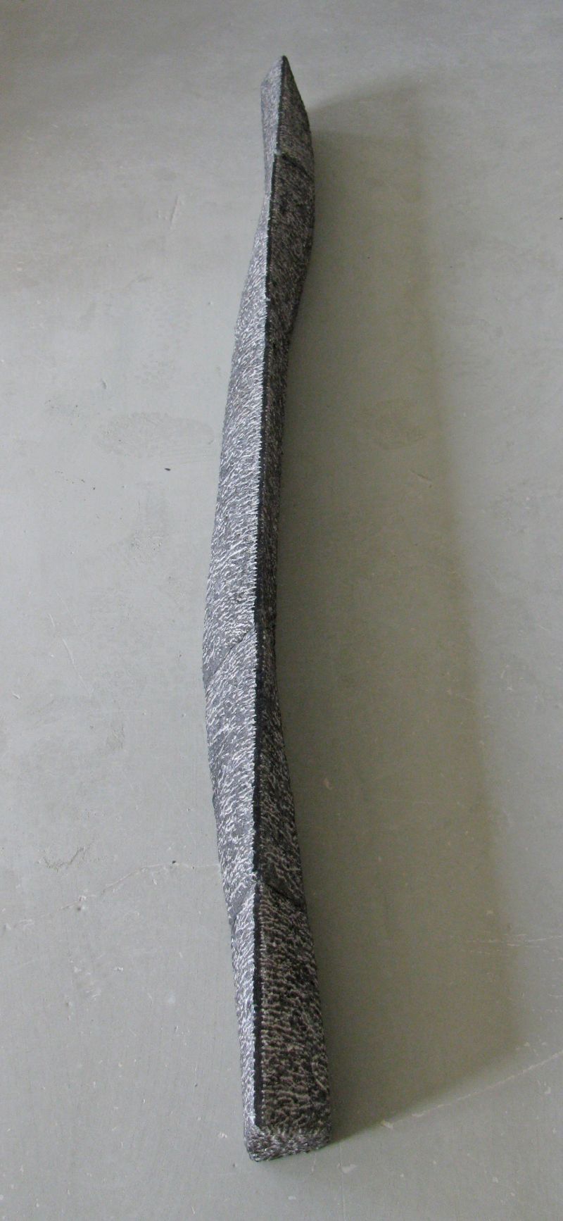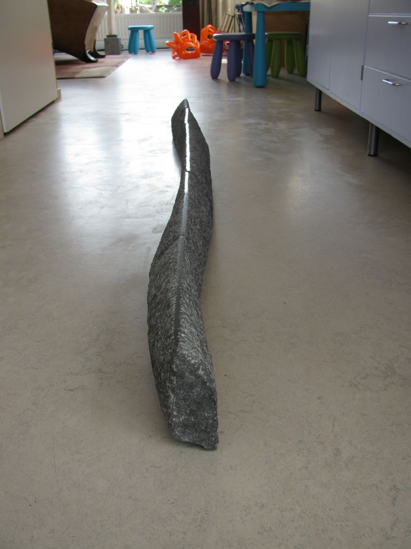 Een van mijn upcycling-projecten. Wat kun je doen met een serie oude hardstenen vensterbanken. Ik vond ze ergens bij de sloop. Met deze vrij platte stenen heb ik gezocht naar een beeld waar toch ruimte en beweging inzit. Ruw gehakt met de puntbeitel. De afzonderlijke delen zijn nog duidelijk zichtbaar. De smalle top is glanzend zwart geplijst en trekt een rechte middelijn. Een onzichtbare metalen strip aan de onderkant houdt de stenen op zijn plaats.