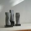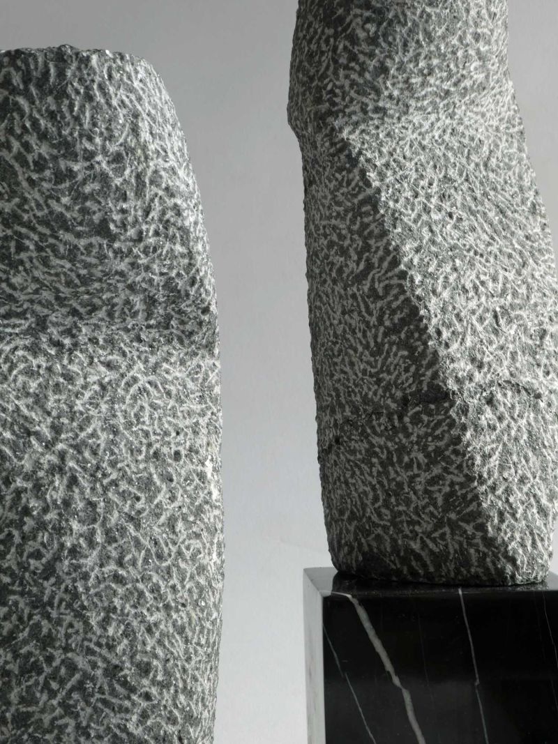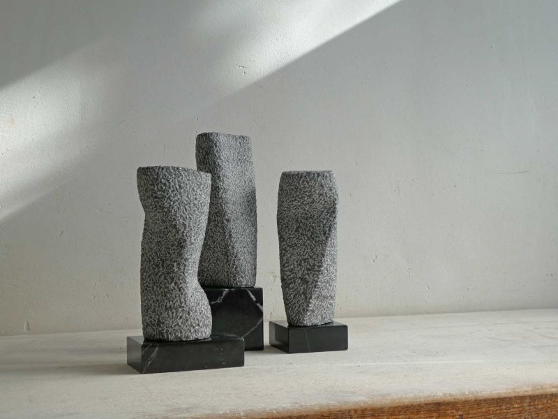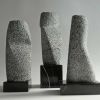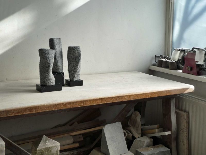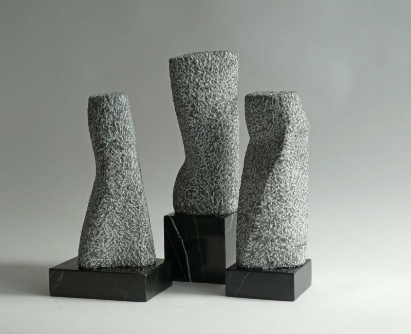 Een hedendaagse, abstracte verbeelding van het thema ‘De Drie Gratiën’. Ontstaan uit drie kleine boorkolommen van Iers hardsteen. Inspiratie voor mij was de combinatie van drie bevallige figuren, in verschillende poses. Om binnen de beperking van de kleine stenen toch de suggestie van beweging te creëren. En dat de drie losse delen elkaar beïnvloeden en samen een eenheid vormen.