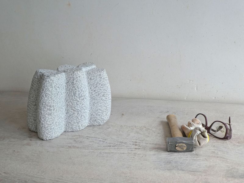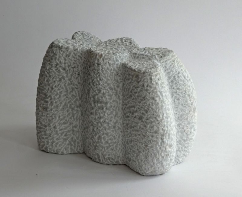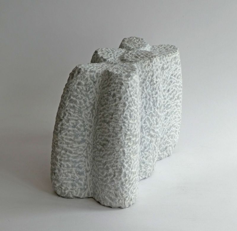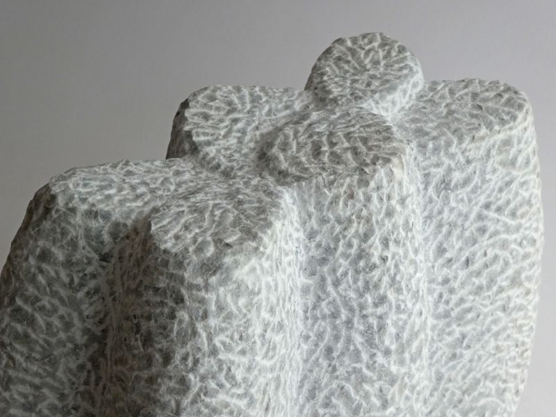Een klein, intiem beeldje. Gemaakt van een lichtgrijze marmer, waar al eerder in gehakt was. Op die vorm ben ik verder gaan werken. Een groepje, dicht op elkaar. Voortbordurend op eerder thema’s en beelden zoals ‘Gesprek met een steen II’ en de verschillende ‘Companies’. De structuur van de puntbeitel is zichtbaar, het blijft zo een beetje schetsmatig.