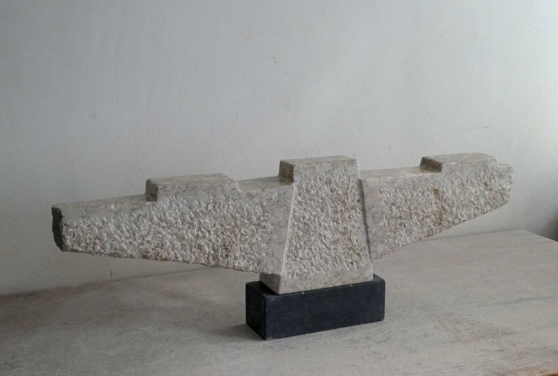 De steen was niet zo dik, ik heb vooral de breedte benut. Een weids gebaar, dat associaties kan oproepen met het spreiden van je vleugels, maar niet zozeer met vliegen/opstijgen. Stevig en robuust, maar wel los van de grond.